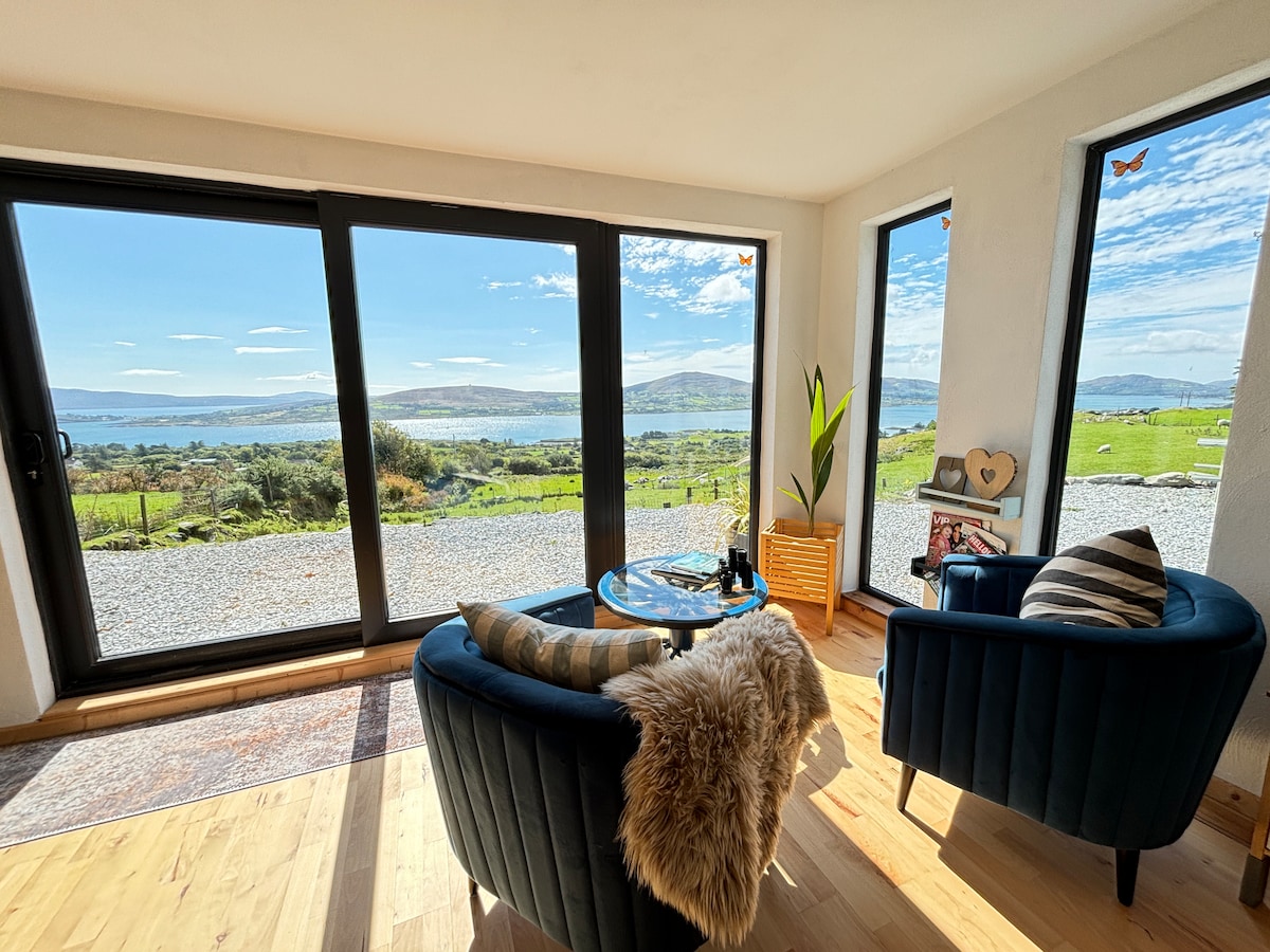 Escape to The Hidden Haven at Derry Duff; a unique, stylish, luxury farm-stay lodge, in a secluded corner of our organic West Cork hill farm, just 20 minutes from Bantry and Glengarriff. We designed this boutique, eco retreat to welcome guests to enjoy panoramic mountain views, the wild landscape, a lakeside hot tub, peace, calm and our organic produce. The Hidden Haven offers a romantic farm-stay experience with the space to reconnect, unwind, and rest surrounded by the quiet rhythm of nature.