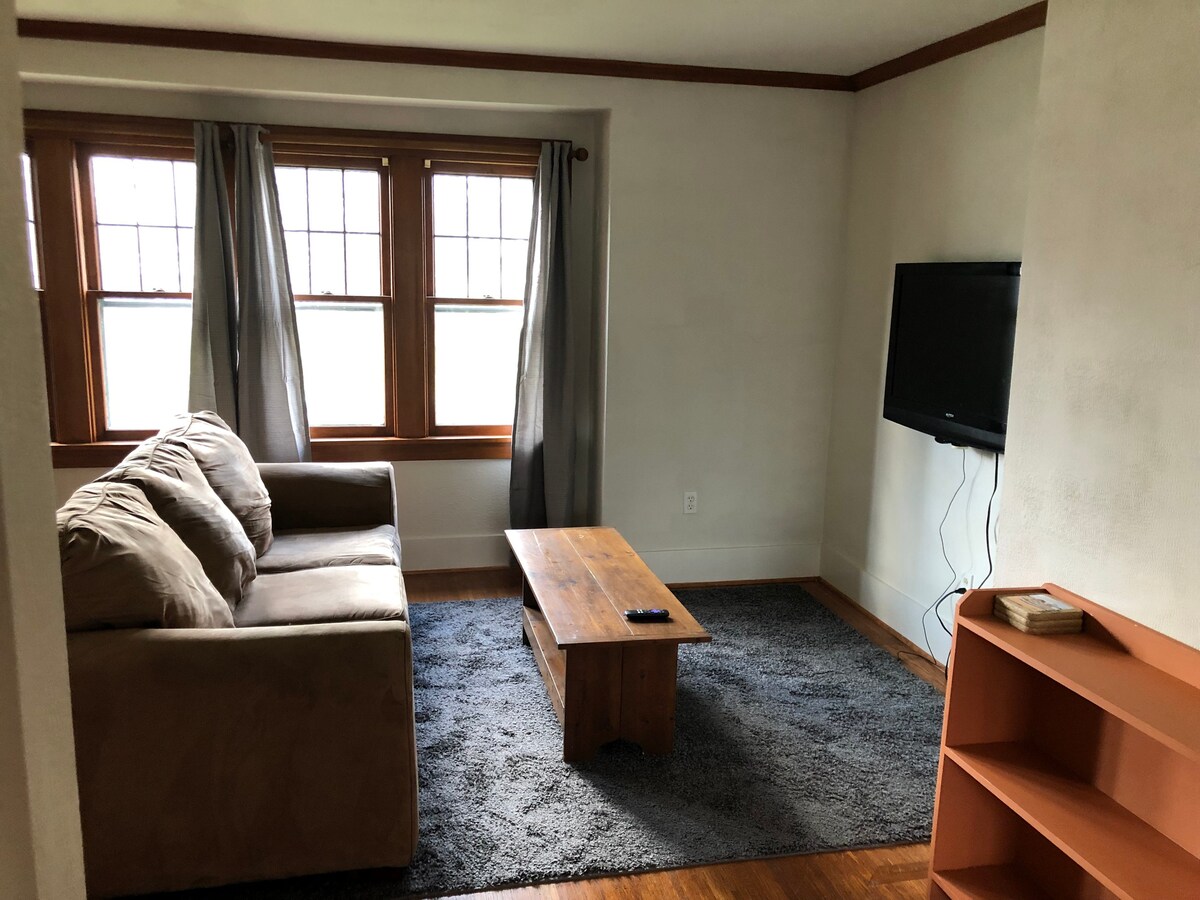 Tuck away on the private 3rd floor within our century-old home in a historic district (please read full listing). 2 comfy beds. Great for 2 guests or family with kid(s). Enjoy simple comfort with lots of small touches to feel at home. You'll be next to a park & 10min to downtown OR Lake Ontario! There's space to work or relax, two TVs, and a light-duty kitchenette. Stocked with breakfast items, coffee, teas & snacks. Near hospital. 15min to airport, 18 to RIT (Pets ok. READ PET POLICY first)
