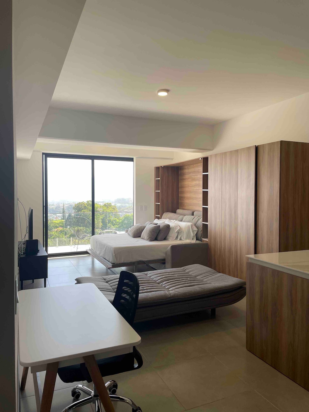 Enjoy a spectacular view of the volcanoes from your private balcony in this cozy, modern studio. It’s fully equipped with high-quality amenities, from a comfy queen-size bed to a handy sofa bed for extra guests. With a fully equipped kitchen, and black out curtains, you’ll have everything you need for a relaxed and fun stay. It includes one parking space, on-site gym and access to the building’s convenience store. Just 8 minutes from the airport is the perfect place for you and your beloved