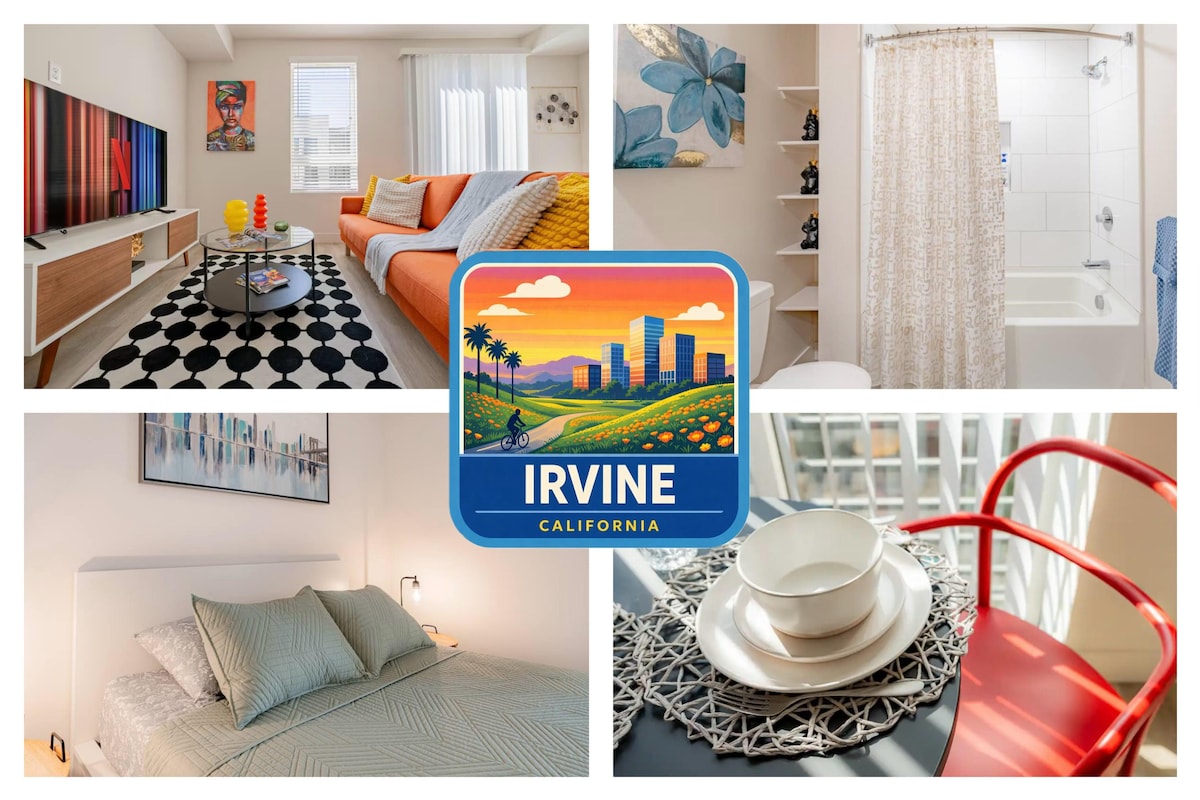 location!Walking distance to irvine spectrum Restaurants &,Starbucks . Modern & Spacious. 2 bedrooms/2 Bathrooms Apt with fully equipped kitchen. Mins to Beach, Disney, Airport and UCI. • 2 Assigned Free Parking Spots • 500 Mbps WiFi • Smart TVs • Self Check-In • In-Unit Washer/Dryer • Free Gym Access • Swimming Pool w/Hot Tub • Gated Community Please note: The photos shown are representative images. The actual unit, furniture, and decor may vary.