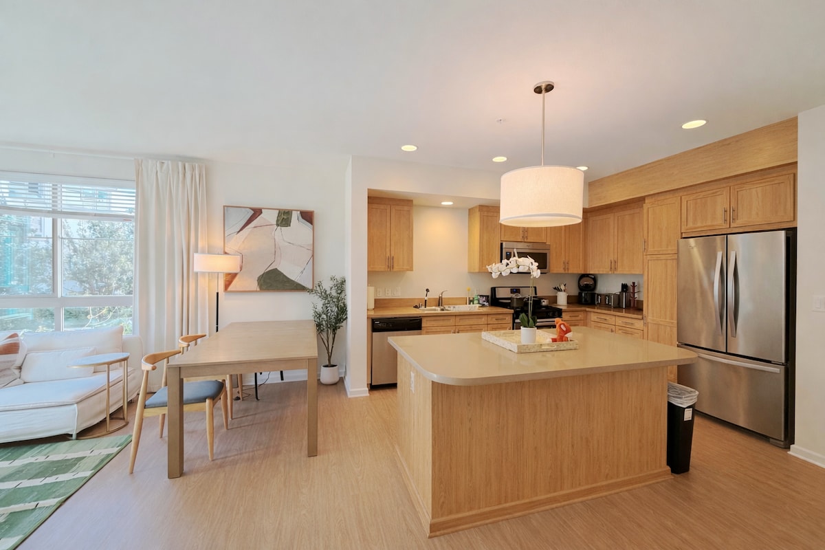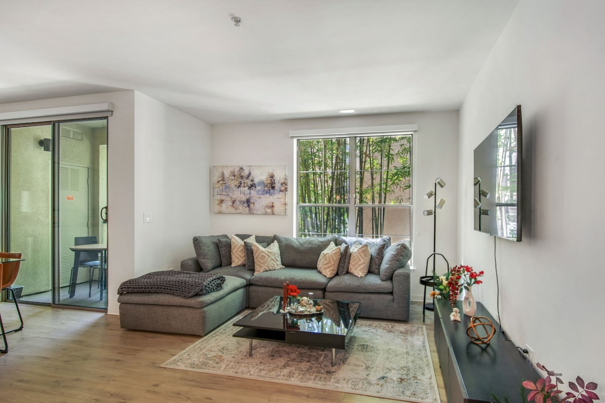 A modern wonder w/ stainless steel upgraded appliances. A high end luxury complex. Approximately 925 sq ft. Cali KING Bed. Smart 55” TV in the bedroom. A 65” Smart TV in the living room. You can log-in to your personal Smart TV Apps. Private patio with table and two chairs. In unit washer/dryer (detergent). Perfect for a family or couple getaway, business trip or long stay. Always clean and ready when you arrive. Prime location in Irvine near 405 freeway. Please ask us any questions.