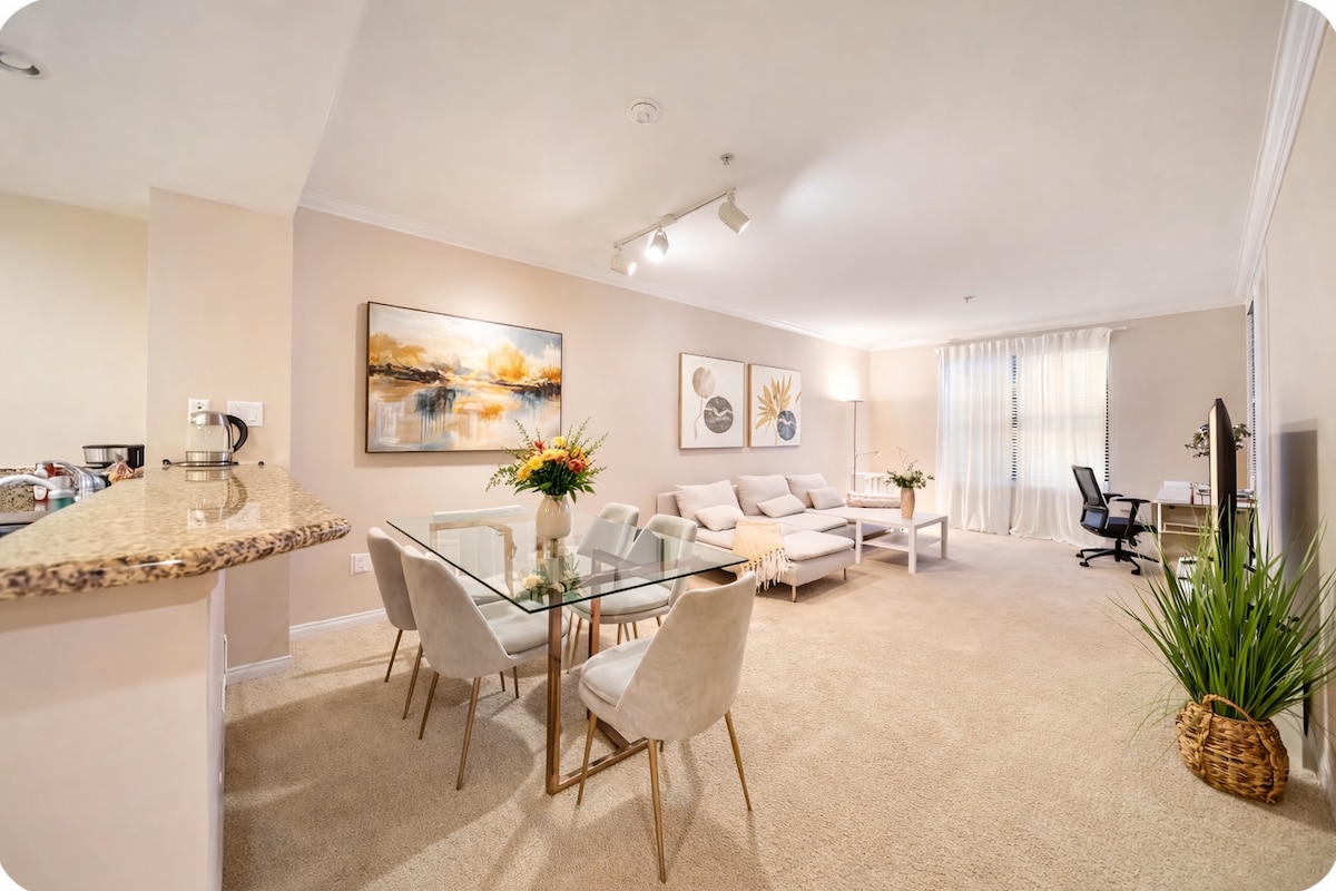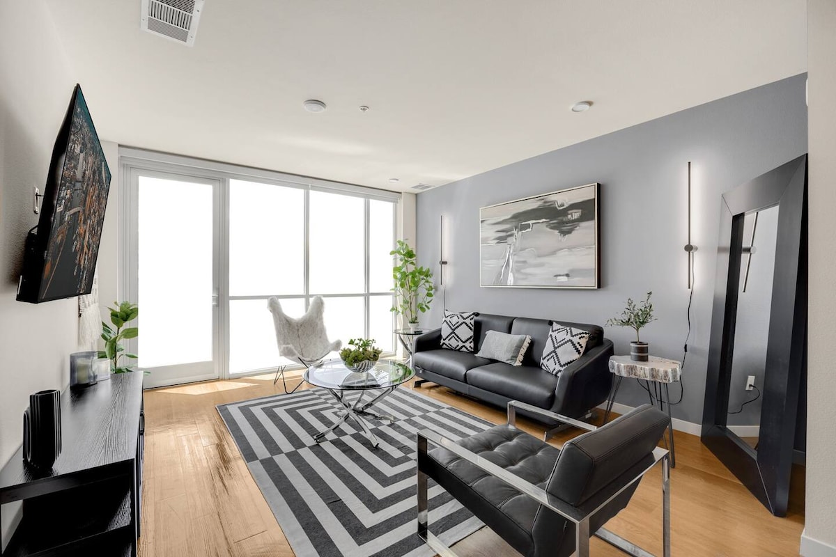 Nothing less than a SPECTACULAR, private, serene apartment HOME. KING Bed. Sleeps 2 comfortably. Sleeping in couch is optional. Full shower/tub. Approximately 725 sq. ft. A 65” Smart TV in the living room. In unit Washer/Dryer (detergent). Full kitchen with everything you need for a short or long stay. Refrigerator with ice maker. FAST WiFi. Shared pool, jacuzzi and gym. Completely sanitized and clean. One assigned parking space. Please come in peace or don’t come at all. Enjoy