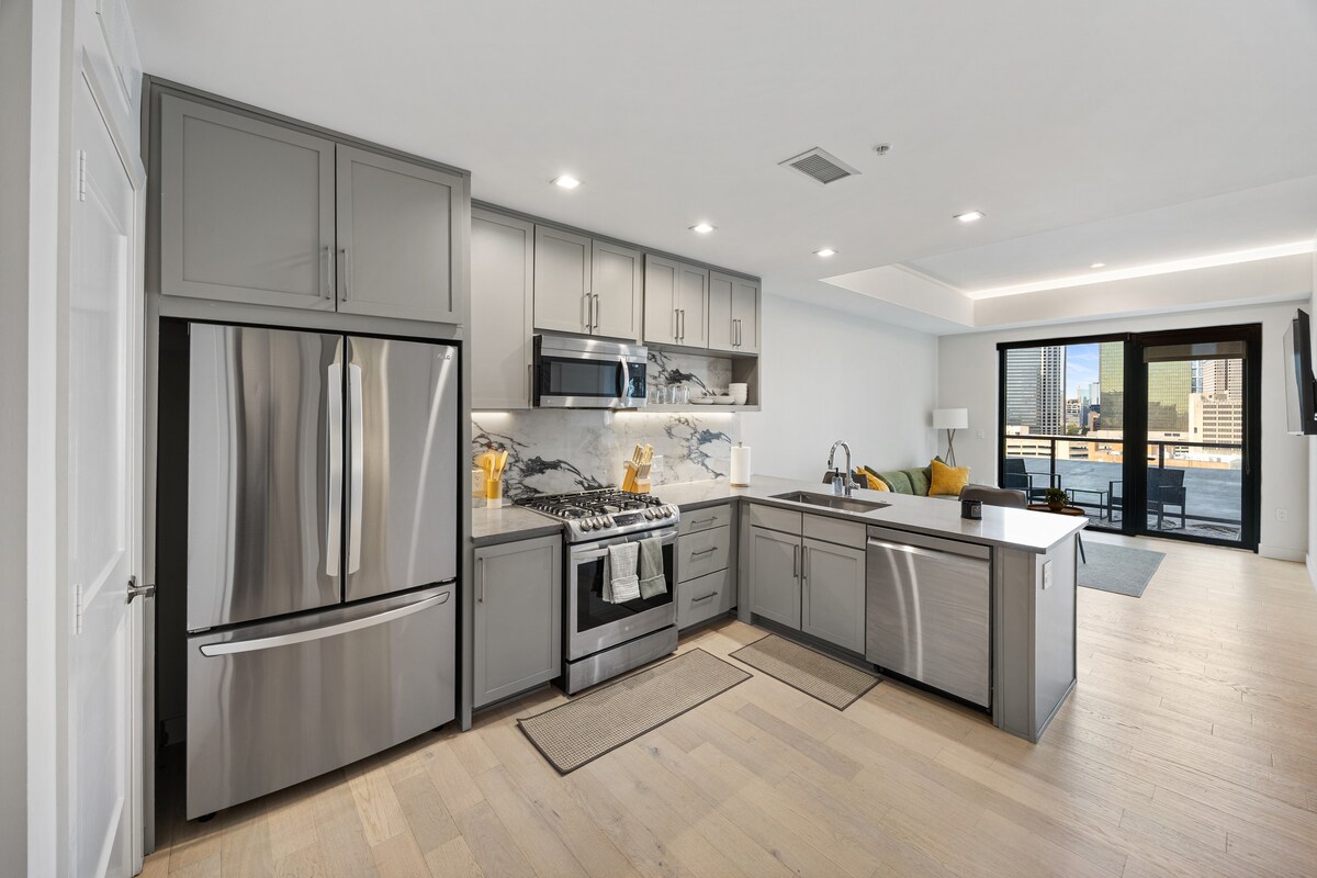 ★ Renovated luxury condo in a boutique Dallas complex ☞ Cedar-fenced turfed backyard (ideal for dogs) ☞ Dedicated home office + high-speed internet ☞ 65” smart TV + luxe quartz fireplace ☞ Spa-style bath w/ rainfall shower + wand ☞ King bed + walk-in closet w/ makeup station ☞ Adjacent parking + private entrance ☞ Wayzn smart dog door (select stays) No deposit. Pet-friendly. Perfect for extended stays + work from home with full-size washer/dryer, spacious quartz dining counter and fast Wi-Fi.
