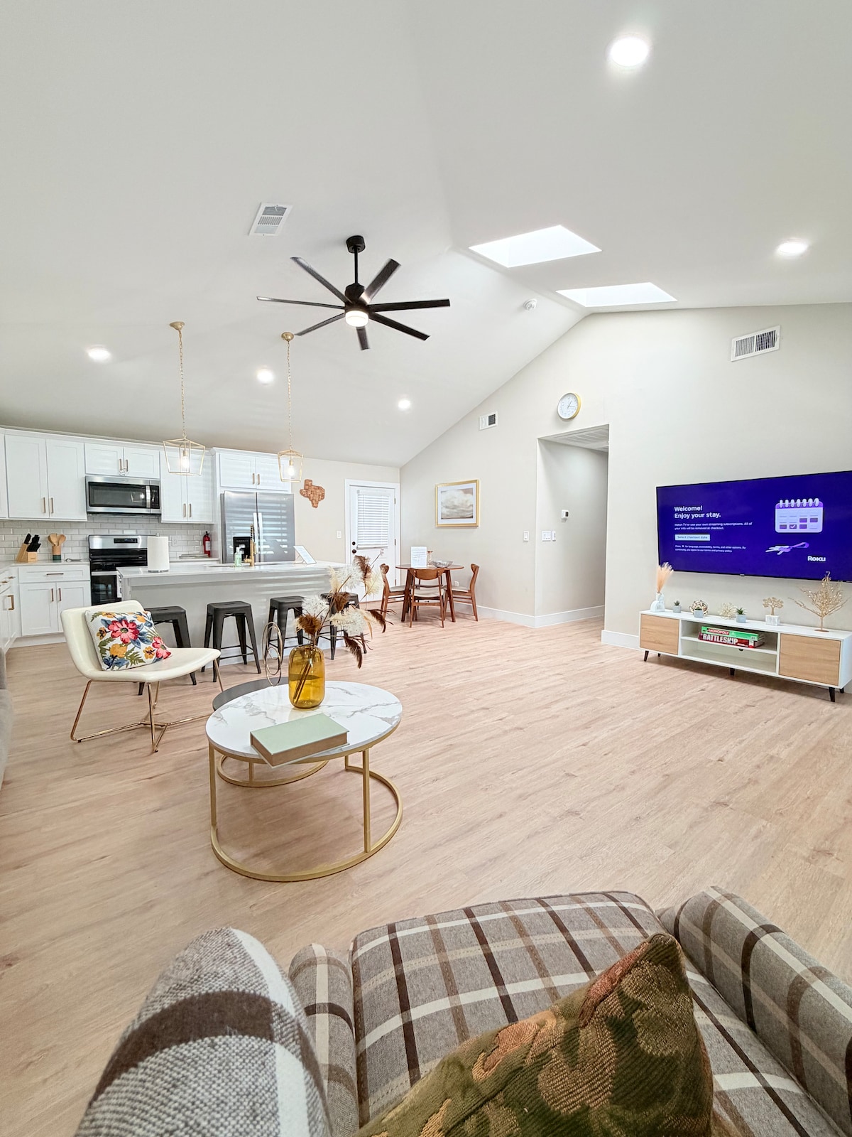 ✅ 2173 square feet - 3 Bedrooms - 2 Bathrooms ✅ 5 arcade games, foosball table, shuffleboard, board games ✅ Backyard w/ pool, hot tub, dining table, loungers, and BBQ grill ✅ Full gourmet kitchen + large dining table for 10 ✅ Living room w/ huge sectional couch and 65" TV ✅ Self Check-in / Washer & Dryer / Fast Wifi Our house max is 8 guests with no more than 6 adults. No more than 4 unrelated individuals permitted and anyone coming to the home counts towards that total.