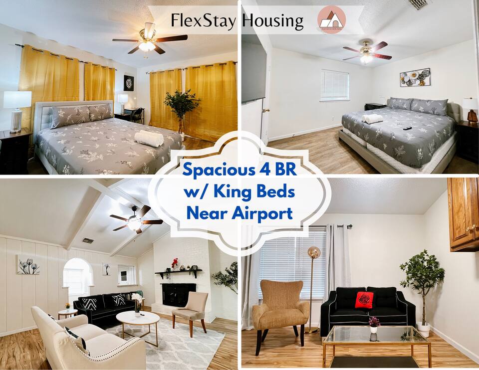 4B2B - This 4 bedroom, 2 bath home is only a 7 minute drive to the DFW airport! It lies in a quiet neighborhood. There are 3 king beds and 2 twin beds. There are 2 TVs, one in the living room and one in the bedroom, and a fenced yard. This home is designed for temporary, month-to-month rental, fully furnished and stocked. 8 minutes to Irving Arts Center 15 minutes to AT&T Stadium, Toyota music Factory, Irving Convention Center, Six Flags