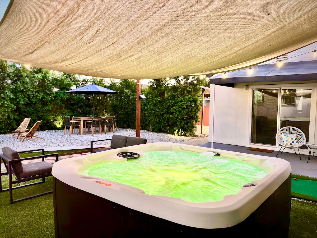 Melt away stress in the PRIVATE exclusive outdoor hot tub of this designer home. Indulge in the luxury of a carefully curated space with colorful rooms, intricate tile-work, eclectic furnishings and decor, and a lush PRIVATE & ENCLOSED front garden with a LARGE 6 burner BBQ for some summer cooking. WE ACCEPT UP TO 2 DOGS WITH AN ADDITIONAL $150 PET CLEANING FEE. NO CATS. PLEASE TAKE NOTICE THAT THERE ARE 3 EXTERIOR SURVEILLANCE VIDEO CAMERAS IN PARKING AREA AND DRIVEWAY, FOR GUEST SAFETY.
