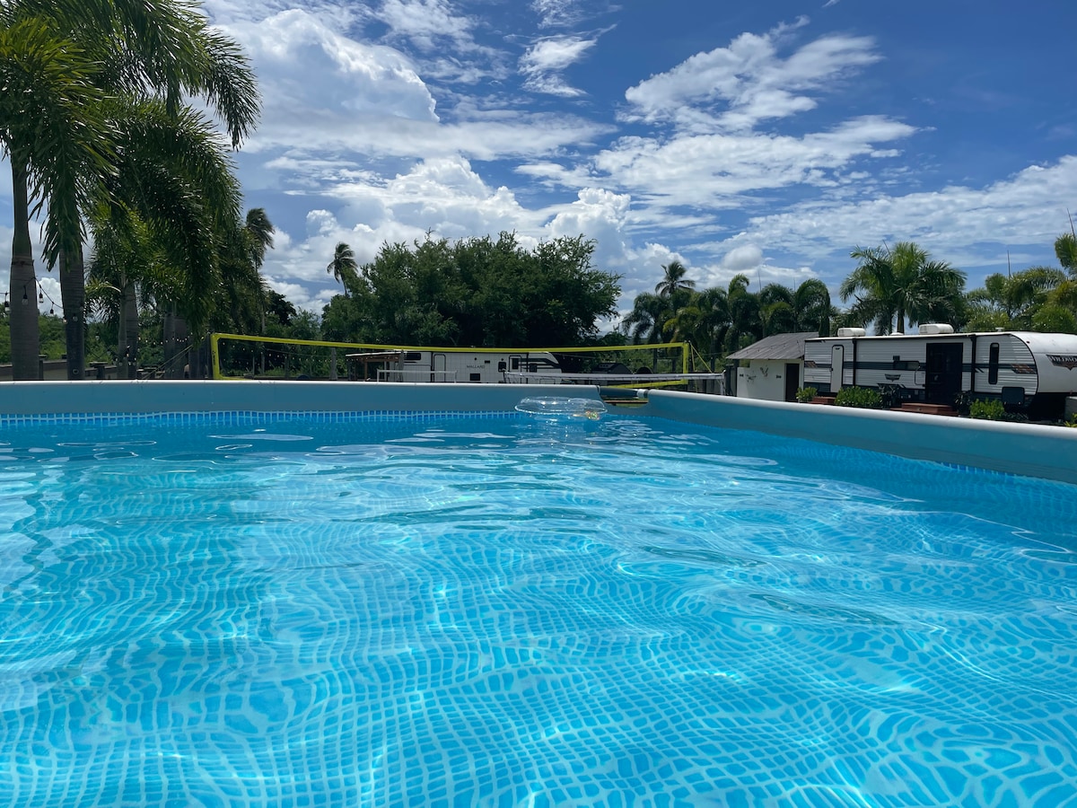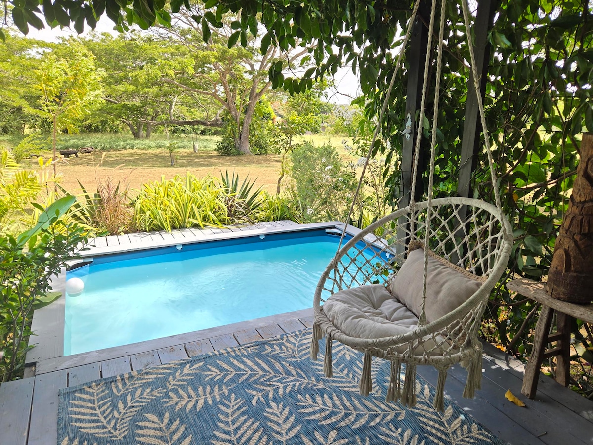 Accommodation type:** Triangular cabin - **Location:** 6 minutes by car from the beach, restaurants and supermarket; 15 minutes from Rafael Hernández Airport. - **Facilities:** - Private - Pool for two (without heater) - BBQ (charcoal not included) - Small electric stove - Apartment refrigerator - Cutlery, pan and pot - Hot water in shower - Generator and cistern - **Kitchen:** Exterior - **Bathroom:** Interior of the cabin - **Parking:** Inside the patio