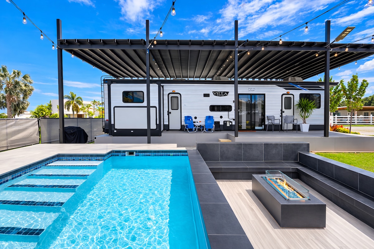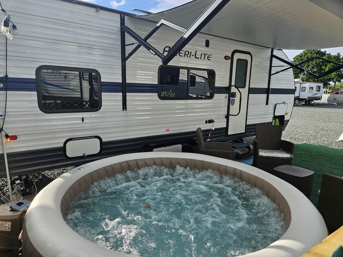 Unique experience for couples. This is a 30’ RV Camper furnished with modern facilities and full & unique -service amenities, offering complimentary Wi-Fi throughout your stay. You can enjoy your own camping experience with the commodities of a house. The Jacuzzi-warm water and bubbles at any time of the day or either enjoy nearby beaches and sight seen places, just minutes away. There are different nearby restaurants and bars for your dining pleasure. Ask how you can customize your experience.