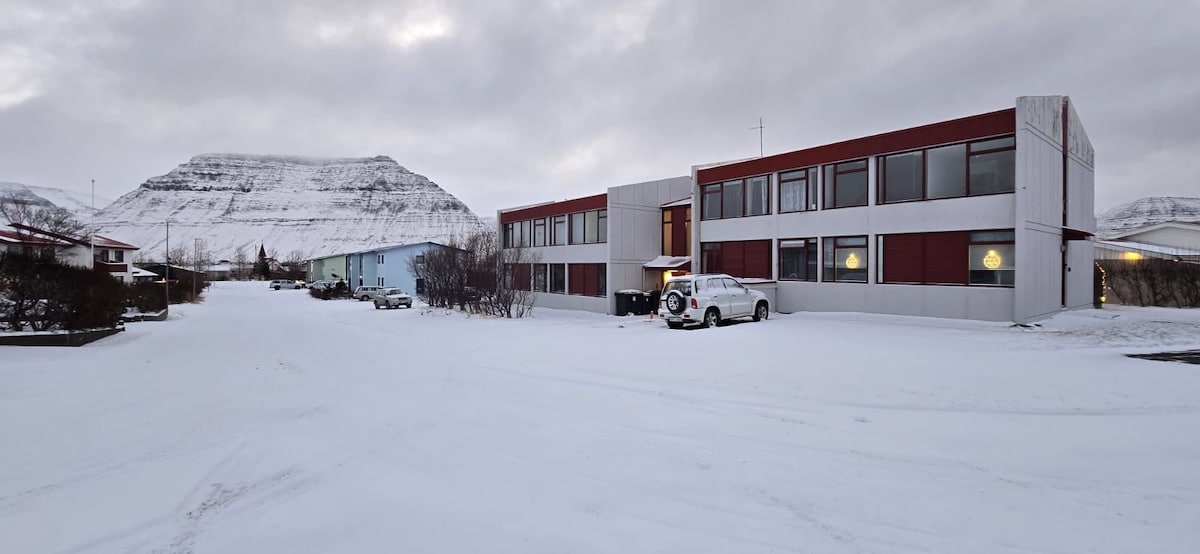 A beautiful apartment with a panoramic view of probably the most beautiful fjord in Iceland. Stylish and nicely furnished - 60s style. 173 m2. Built in 1975 as a headmaster´s apartment for the elementary school that was resided on the ground floor. That space is presently not in use, which gives you more privacy. Luxurious apartment in a very remote place.