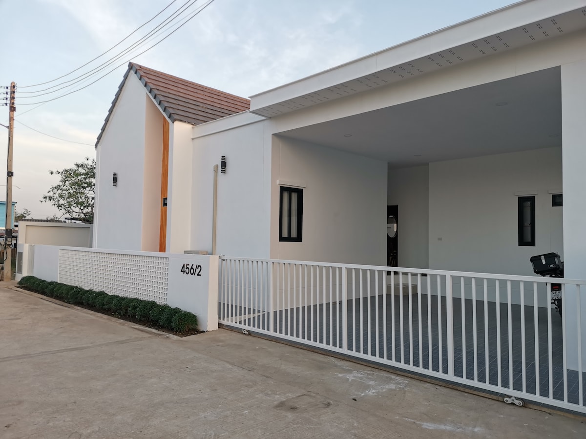 House with 2 bedrooms, 2 bathrooms, can park 2 cars in front of the house, has a digital door lock system. Inside the house consists of 1 master bedroom and 1 regular bedroom, 2 bathrooms.The common area of the house is a living room with a smart TV. and area for dining special kitchen Including a washing machine behind the house.Around the house there is a garden of trees. And a large door on the side for receiving sunlight and cool breezes in the morning.