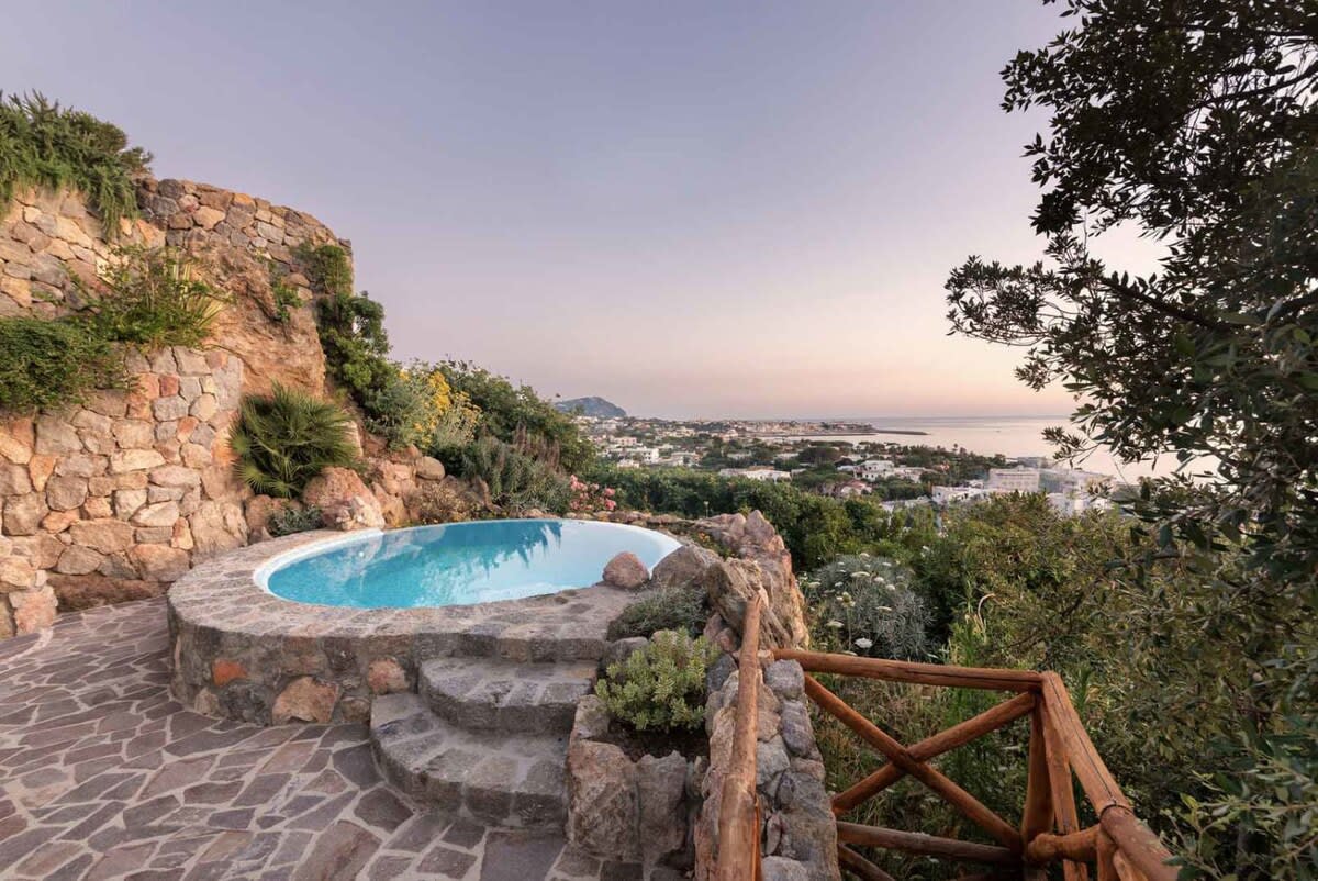 Una piscina termale, una sauna naturale. Una villa esclusiva immersa in un rigoglioso giardino, sospesa tra cielo e mare. Nell'incanto della Baia di Citara una delle più suggestive dell'isola perché esposta interamente ad Ovest: tramonti da sogno col sole rosso che si va spegnendo nel mare aperto dietro l'isola di Ventotene, unico ostacolo allo sguardo spalancato sull'orizzonte immenso. Sei camere da letto doppie, fresche, panoramiche ognuna con suo bagno, ventilatori e mini frigo.