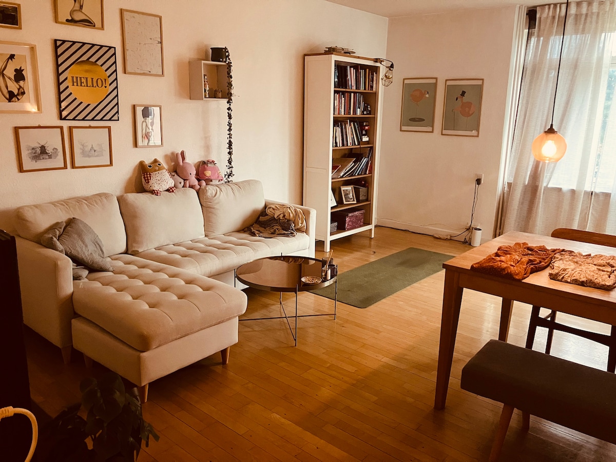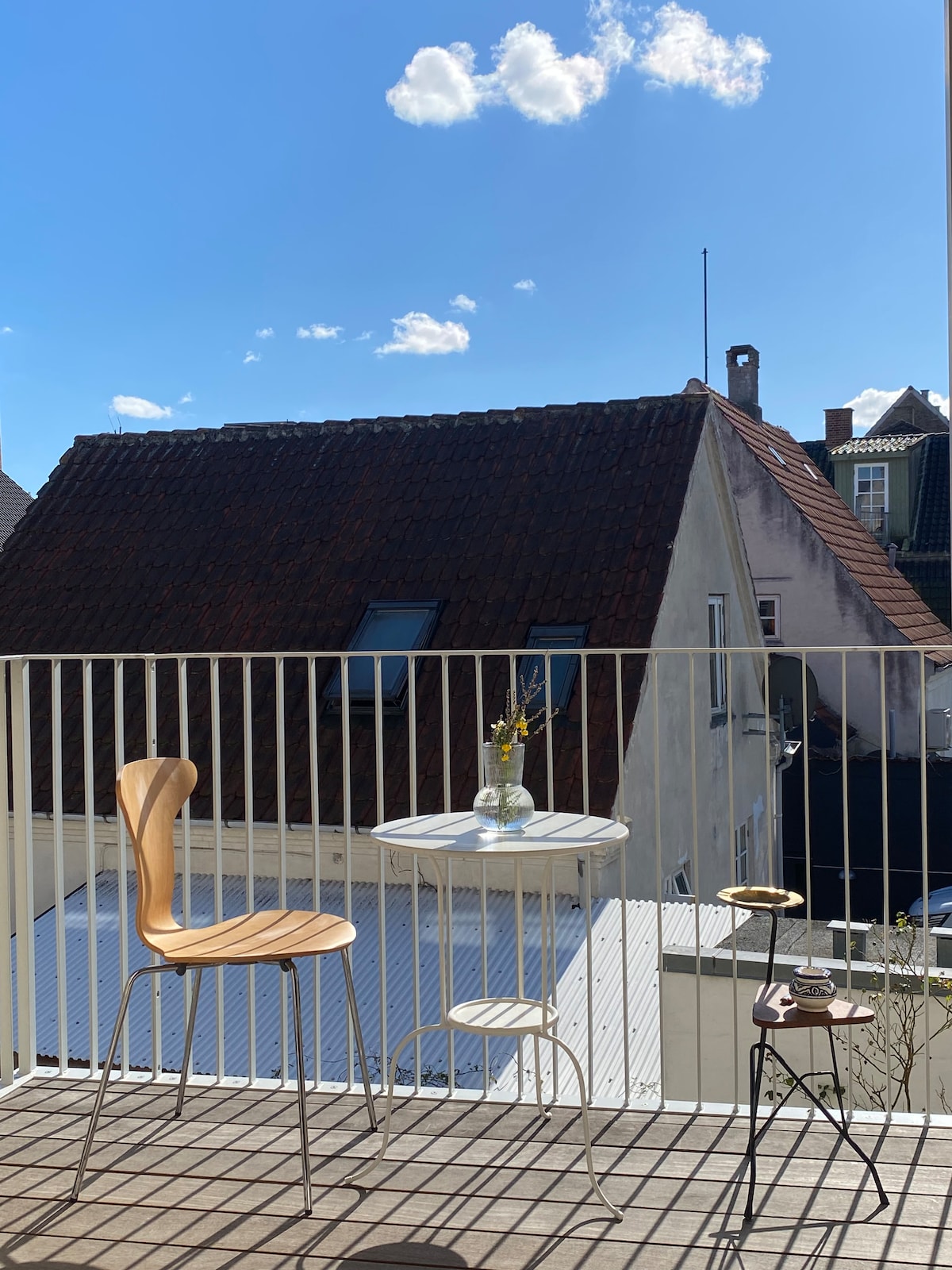 A very cosy and homey apartment on the top floor with a balcony, a lot of light and a good view from both sides of the building. There is a bed for two people, storage space for clothing, a dining table and a fully functioning kitchen with all supplies. It is a one-bedroom with a partly isolated bed. The apartment is 42sqm. There is enough floor space for a madras to be placed to make it possible for more than 2 people to stay for an extra fee.