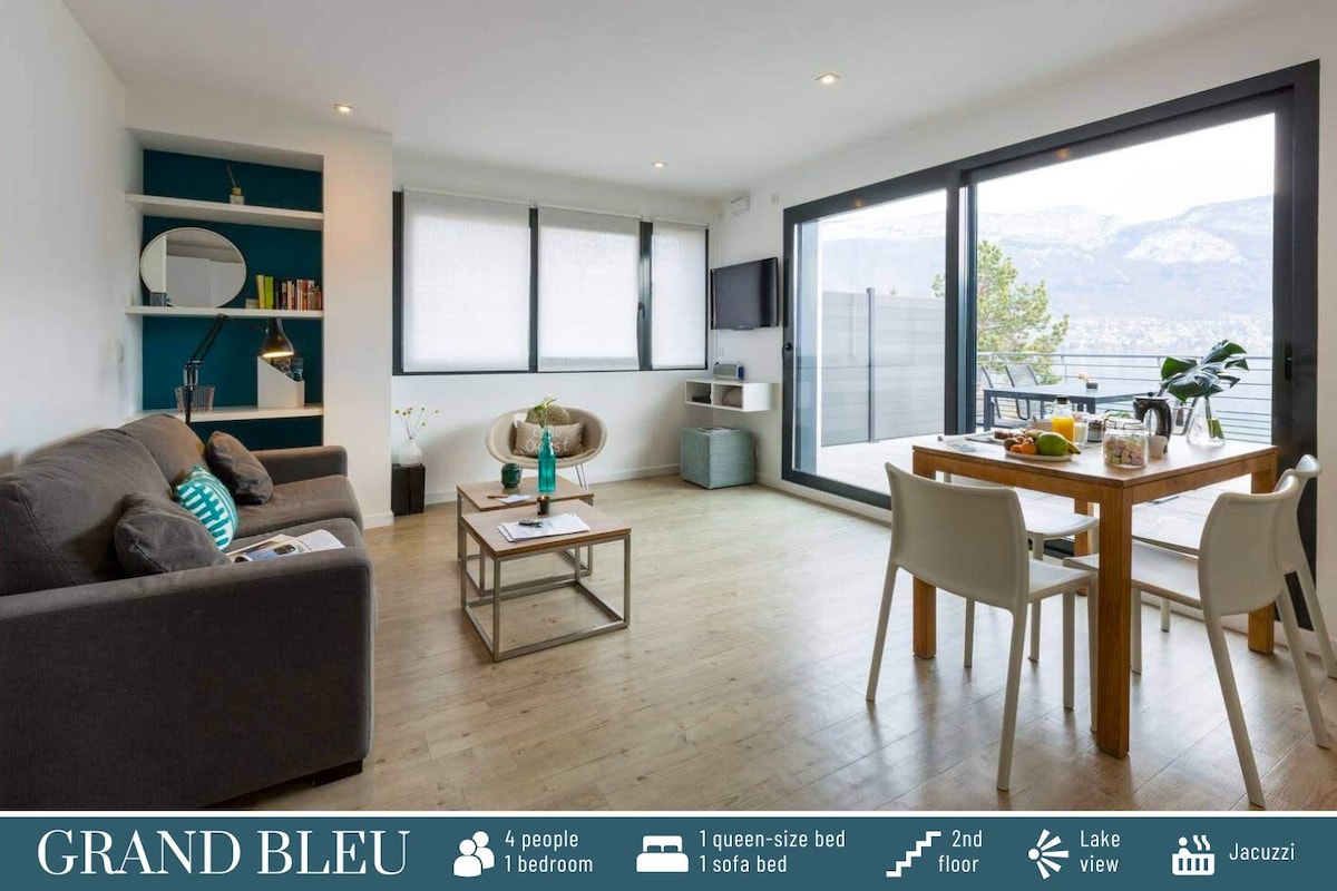 Le Grand Bleu: Premium 4-star 50 m² apartment on the second floor, fully equipped for a comfortable stay. It features a separate double bedroom and a sofa bed in the living area.<br>Relax in your private hot tub on the spacious dining terrace with stunning views of the lake and mountains. Set in a peaceful lakeside location, it’s the perfect place to unwind.<br>Secure parking for one car is also provided.<br><br> Find us on Google Maps for more information.