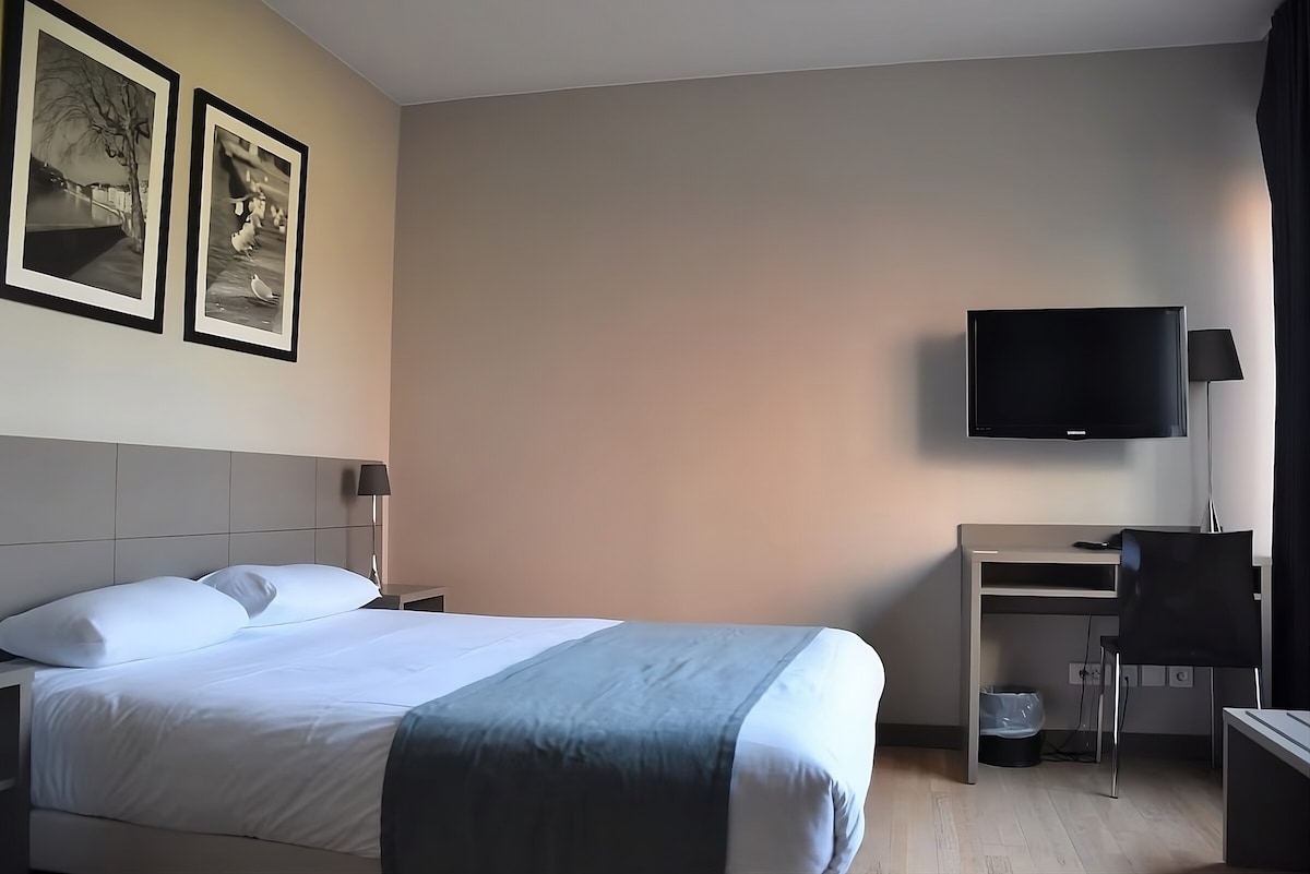 Situated on the Place des Célestins, between the Rhône and the Saône rivers, Hôtel des Artistes offers a heaven of peace in the heart of the city. This charming hotel, renovated over the years, provides a warm, cosy and hushed atmosphere. Depending on your mood, you can move to your right towards the boutiques and stores or to your left towards the old city and its “traboules” (narrow passages across buildings). In whatever direction, the city is yours to discover. Pleasant room (between 15 and 19 square meters) inviting relaxation in a calm and quiet atmosphere overlooking on the back street. It features a high quality 140x200 cm or 160x200 cm bedding, an office space with free Wi-Fi and Canal+ TV channel.