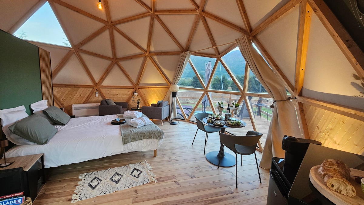 Un grand dôme géodésique installé dans une prairie à côté de grands noyers, avec un toit ouvrant pour contempler les étoiles, des transats et une balançoire à l'ombre des branches, une rivière à 2 min à pieds.... Intimité et simplicité pour une immersion en pleine nature. Bienvenue au Moulin de Recours, au cœur du Trièves, pour un moment à l'écart de la foule, dans une nature préservée et un hébergement confortable. Location de VAE sur place. Plusieurs tentes et hébergements sont disponibles.