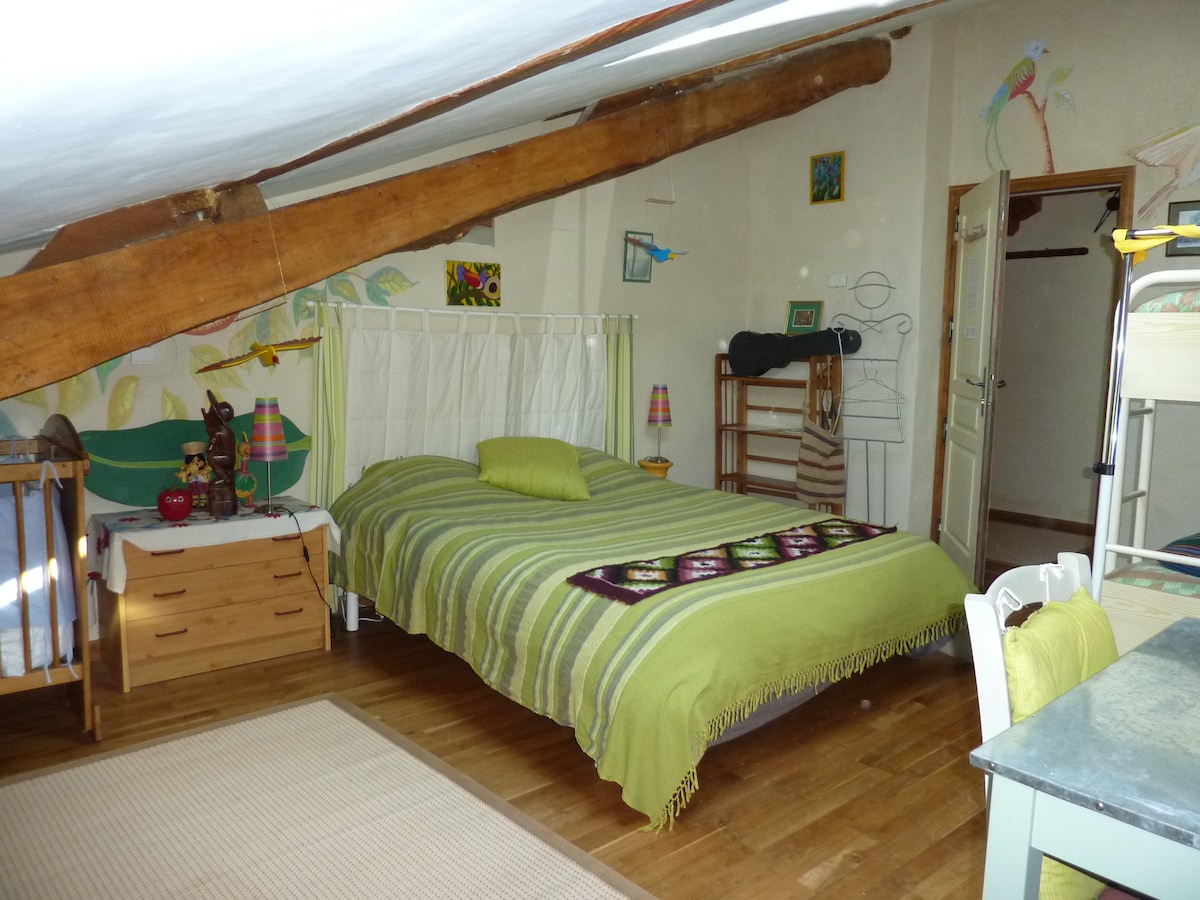 You will have an organic room with a 160 bed (queen) and a single bed. La Source: an organic and vegetarian guest house, a place to live in harmony with Nature and with Ourselves. 5 rooms, 2-4 p, Breakfast included. You will enjoy a swimming pool with out chloro, in nature. Also a big garden, an orchard, vegetable garden, stream, ponds, animals,cabans to play.. It is an old confortably renovated farm house with organic materials. We care for the planet and for our health. Families are welcome