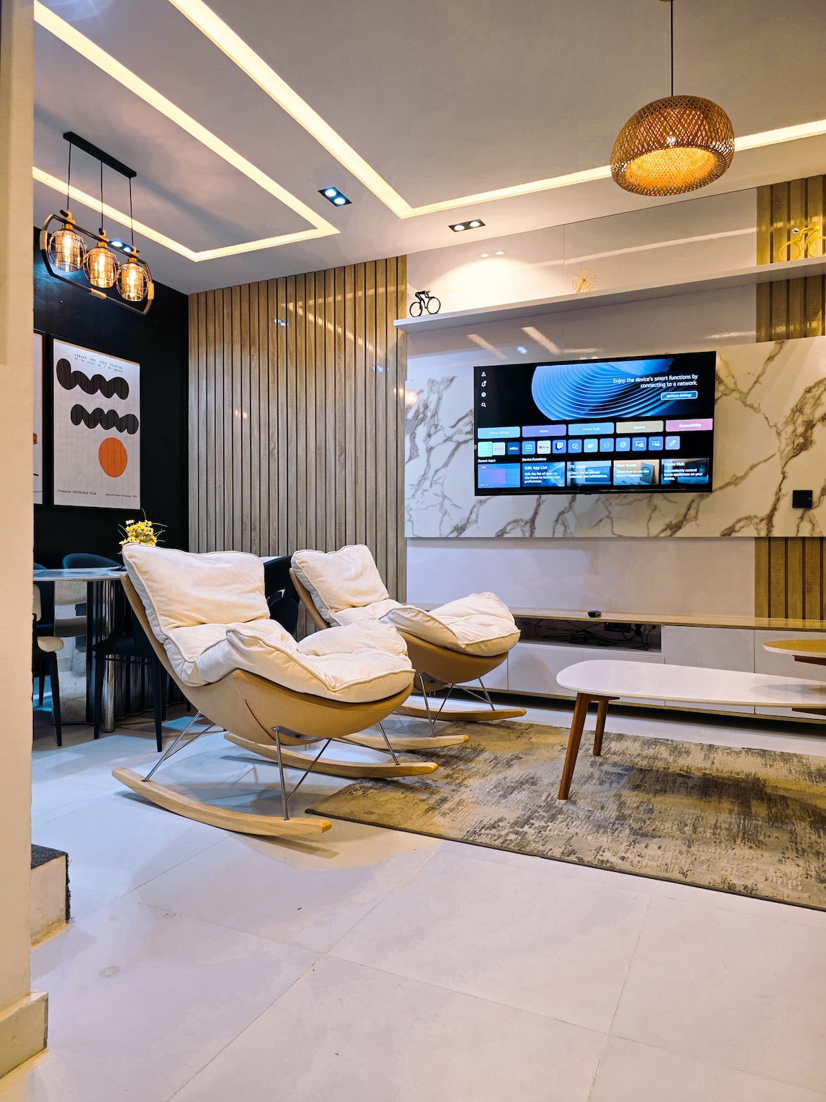 We’ve successfully combined that 5 star hotel feel with a home feel in this strikingly beautiful space. Newly refurbished,The bedroom is demarcated from the living room with pure mahogany wood profiles housing two embedded Tvs..You get your own private Sitting area, Ac, Refrigerator, 55 smart TVs. A spacious modern kitchen with 4 burner stove. The Bathroom comes with hot pressured water. Electricity is 24Hours! Security is 24/7. The wifi is super fast and ideal for working guests.