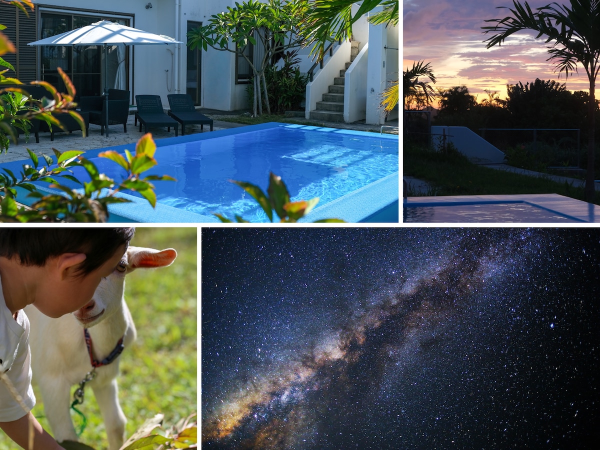 オーシャンビュー石垣のヴィラ「海」は海岸沿いに位置する為、各フロアからのオーシャンビューに加え、ビーチ絵画のように美しい亜熱帯の島、石垣島。 空と海と一体になれるインフィニティプール。南国の花々や果樹に彩られたプールサイド。亜熱帯樹木の木立を2分歩いた先に広がるシークレット・ビーチ。日没後はルーフ・バルコニーで星空観察も。 ヨーロッパ高級リゾートの洗練がつまったラグジュアリー・ヴィラ「オーシャンビュー石垣」は誰にも邪魔されない完全プライベートな癒やし空間。ご家族やご友人、大切な人との、優雅で豊かなひとときをおすごしいただけます。 真っ青な空、真っ青な水平線につながる真っ青なプールに白い雲や濃緑のヤシの木が映り込む。完全プライベートのインフィニティプールは当ヴィラのアイコニックな存在です。石垣島でコバルト・ブルーの海を見渡せるインフィニティプールがあるのはオーシャンビュー石垣だけ。亜熱帯パラダイスをご堪能ください。 屋上のテラスからは水平線に沈む真っ赤な夕日や息を呑むような星空を堪能できます。街灯などの人口照明がないため、晴れた夏の夜には満天の天の川もテラスから見ることができます
