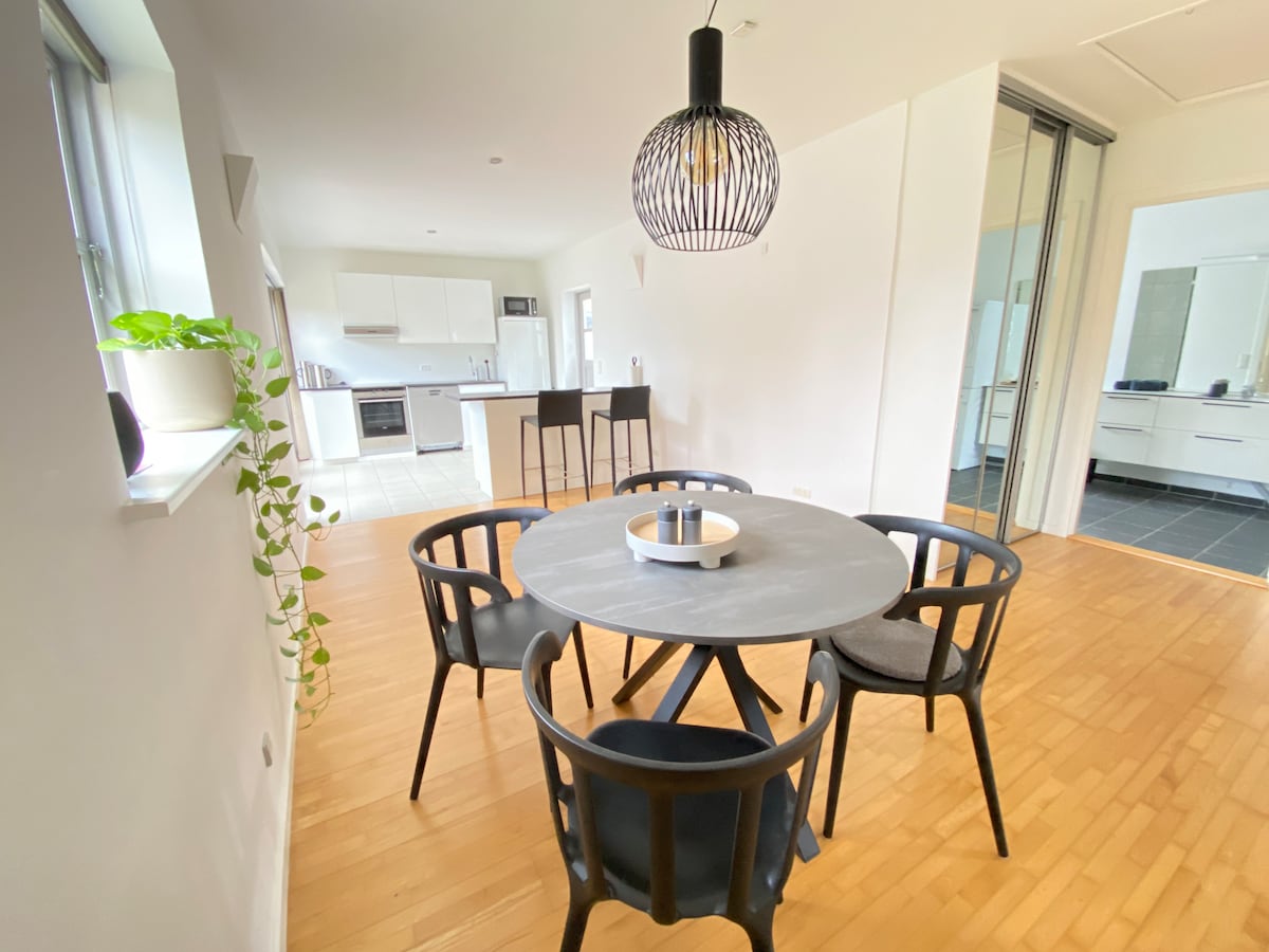 I lejligheden er der plads til 4 gæster og mulighed for en ekstra opredning. Der er kaffe/the til fri benyttelse og hvis du har brug for at vaske tøj er det muligt. Der er altid rent sengetøj på og håndklæder til brug. Lejligheden er udstyret med alt i service og køkken udstyr. Lejligheden ligger lige ved motorvejsafkørsel. Den ligger i et industri kvarter men tæt på sø. Lejligheden er ikke handicap venlig da du skal op på 2. etage, tag lejlighed og der er ingen elevator!!!!