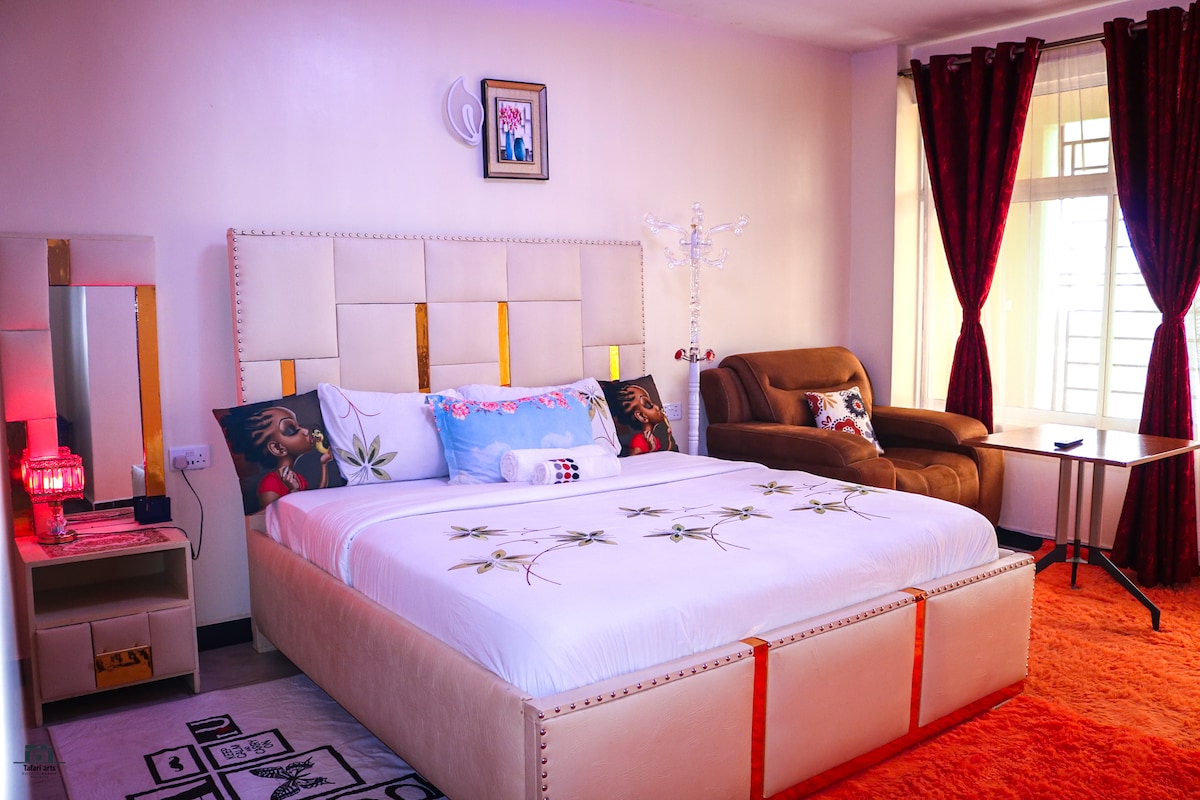 Welcome to Zahara Ayah, a charming urban 2 bedroom retreat offering a unique walk-in nook to unwind your day and plan your thoughts as you lay on your swing chair, a stunning view of Mt. kenya from your sitting and bedroom window. You will be surrounded by nature offering you a serine stay, proximity to malls and game parks, and a chef on request to prepare exiquisite meals. Located near supermarkets, restaurants and entertainment centers in Nanyuki town