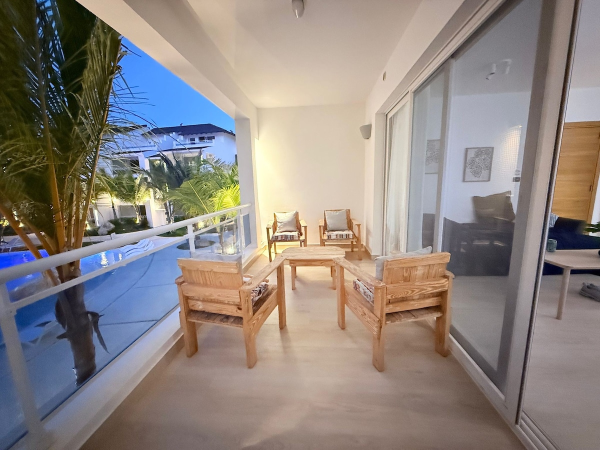 A solo 1 minuto caminando de la playa privada (visible desde la puerta del apartamento), ubicado en área más exclusiva de Bayahibe, Dominicus. Dentro del exclusivo resort Cadaqués: 3 piscinas, muelle privado, parque acuático, restaurante, bar-café, jardines tropicales, Cama king cómoda y sábanas de 300 hilos, A/C de 24,000 BTU, silla columpio (hasta 350 lb), cocina equipada, WiFi rápido y Smart TV, libros, juegos de mesa. Todo listo para que vivas una estadía inolvidable y cómoda en el paraíso!