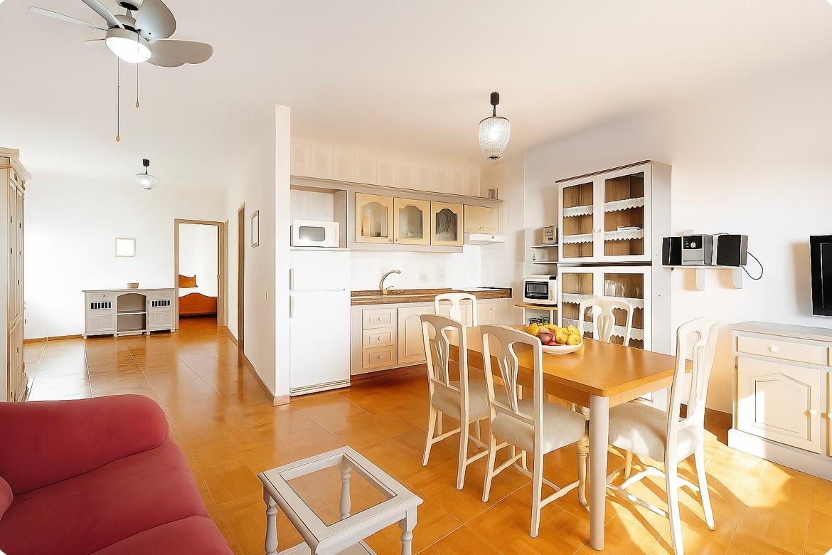 Apartamento luminoso con vistas al mar desde la habitación y desde el balcón situado en el salón. Cuenta con dos camas individuales, sofá cama doble y un patio interior chill-out ideal para relajarse o tomar el sol. Bright apartment with sea views from the bedroom and from the balcony in the living room. Two single beds, double sofa bed and an interior chill-out patio perfect for relaxing or sunbathing