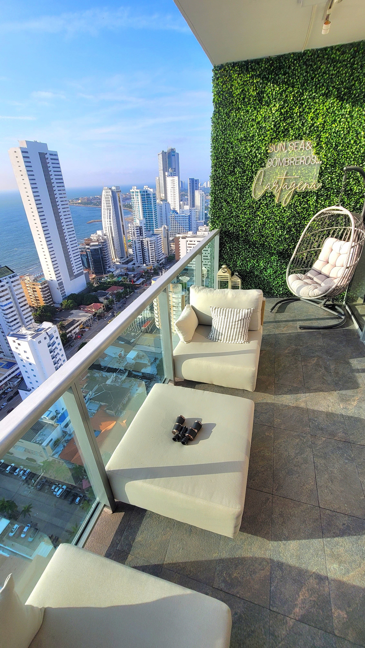 Discover elevated luxury in our 34th-Floor Ocean View Suite — part of the Iconic Portfolio, known for premium design, professional hosting, & unforgettable guest experiences. Wake up above Cartagena’s skyline with panoramic ocean & city views from the condo's floor to ceiling windows & enjoy drinks on it's huge balcony while enjoying stunning sunsets! You'll LOVE: ✨Modern design with A/C in every room ✨Maid & Concierge ✨King bed, premium mattress, linens & pillows for a 5 star quality sleep