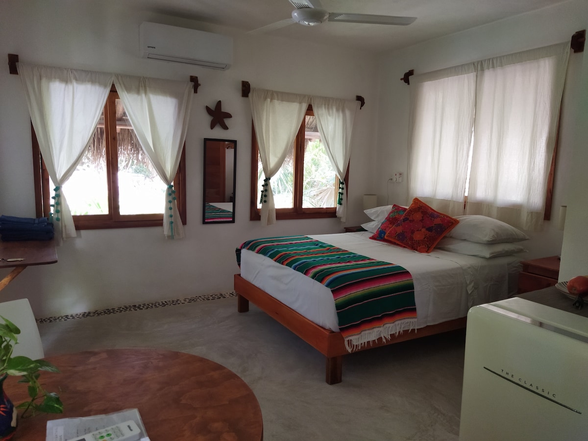 Es un studio acogedor y cómodo con una cocineta bien equipada, un garrafón de agua purificada de 20lt , ventilador, aire condicionado, y una cama queen. Al llegar será recibido con un plato de fruta de temporada. Tiene una pequeña terraza con dos sillas y una mesita. Se encuentra en un edificio de dos plantas en un jardin con árboles tropicales de la region y tiene una entrada privada. Mi casa está en la propiedad. Está ubicado a 2-3 cuadras de la playa y centro .
