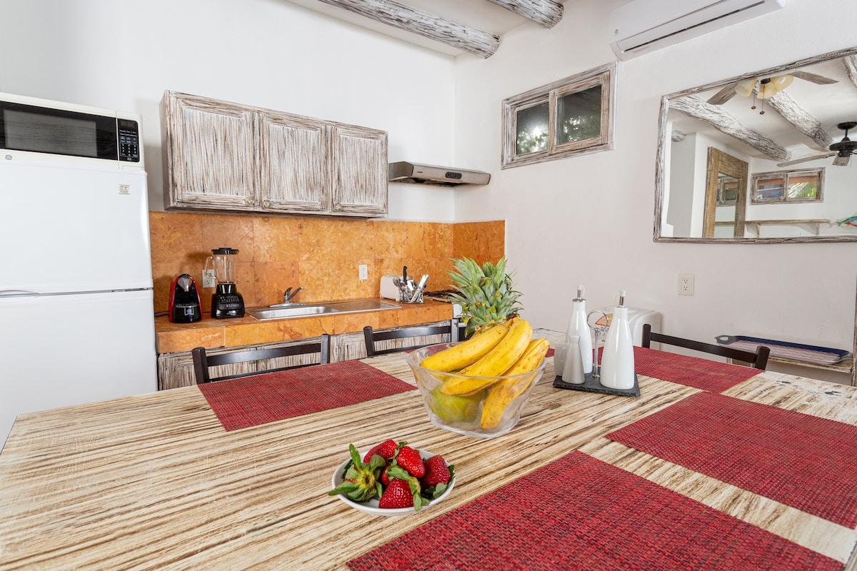 Enjoy this cozy & modern apartment close to the center of Holbox but away from bars and nightlife where you can rest all night in a comfortable bed. Just a few steps from Holbox ferry and around 6 minutes walk from the beautiful Holbox beach. We also include 1 welcome drink per person (Margarita or lemonade) in Alma Bar where you have pool access every day too. Well equipped kitchen with stove, fridge, coffee maker, blender, kettle, AC, ceiling fans, Starlink WIFI, Sofa bed, TV, Warm water.