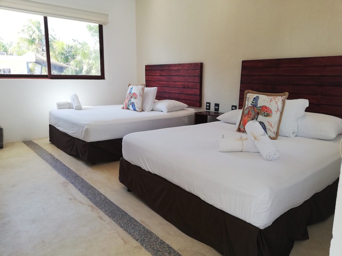 Welcome to our luxurious adults-only compound on Holbox's quiet and exclusive north shore. Enjoy ultimate relaxation in our private second-floor west-facing room with a queen bed, rain shower, balcony, and mini fridge— and included daily housekeeping! With direct beach access, sink your toes into the sand and savor the ocean. Our kitchen, garden, and pool are shared spaces. On occasion, connect with fellow travelers. We limit overlapping guests for an intimate atmosphere during your stay.