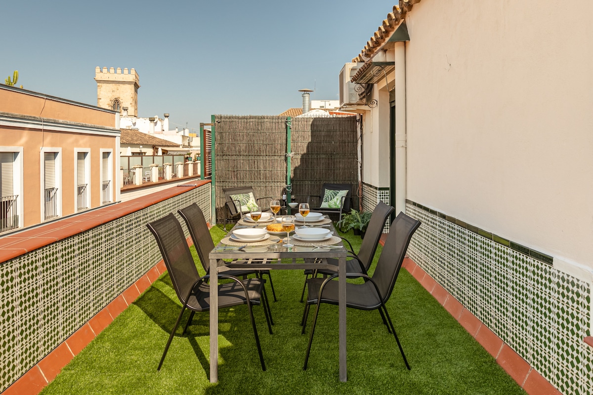 Increíble ático con ascensor para un máximo de 3 personas, con 2 terrazas privadas de uso exclusivo para este Apartamento, la terraza más alta con vistas panorámicas a toda la ciudad, se divisan más de 15 torres históricas del centro histórico incluyendo la Giralda de la Catedral de Sevilla a lo lejos. Es muy exclusivo y original y ha sido conceptualizado con un estilo moderno pero sin perder la esencia de antaño, y dotado con todas las comodidades y detalles para los huéspedes.