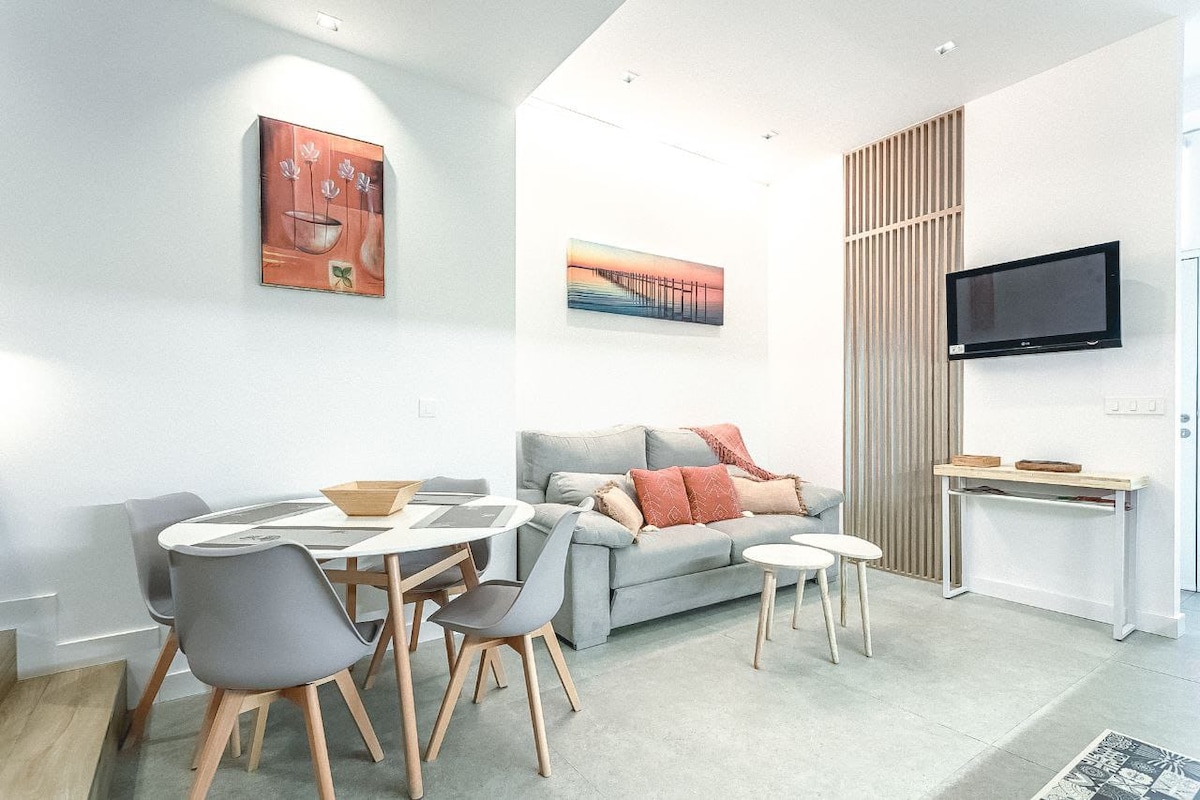 Dúplex moderno con piscina en Centro Histórico. Capacidad para seis personas. En planta baja, salón comedor con cocina integrada y salida al patio donde está ubicada la piscina (compartida entre cinco pisos), un dormitorio independiente y baño completo. En planta alta, un dormitorio independiente, un baño completo y una zona tipo loft abierta con ventanas a la calle y que vuela sobre la cocina con vistas a la piscina en donde hay una cama matrimonio junto a una mesa de trabajo.
