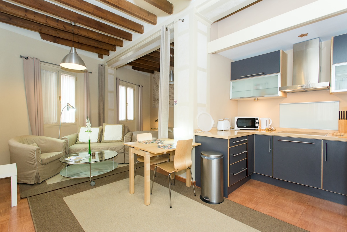 Bright, modern 55sqm loft in the middle of the historic harbor district Arenal, 3 minutes to the bullfightring and next to the river promenade. Cozy industrial design to feel good. High rooms, huge windows. No traffic / pub noise. Ideal for relaxing after city visit or working day. Only 3-10 min walking to the major attractions, cafes, restaurants, tapas, shops, nightlife Fully equipped kitchen, 2 bathrooms. 2 double beds, 1 sofa bed. Direct entrance without stairs. Newly renovated.