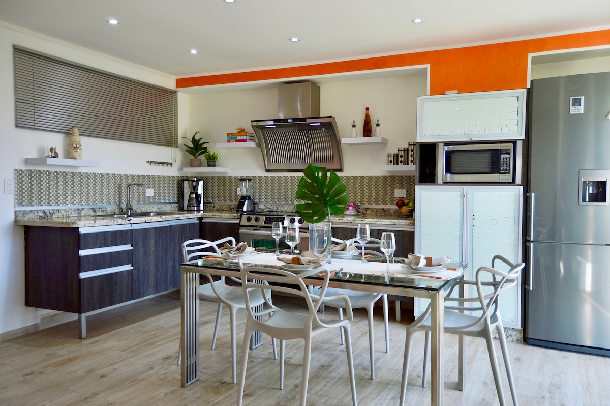 Nuevo y totalmente equipado apto con una cama king. Cerca de la playa y centros comerciales, restaurantes, casinos, farmacias y supermercados. Perfecto para quienes buscan recargar energías después de explorar los tesoros de Mgta, pero también para los viajeros de negocios que buscan un buen descanso nocturno. Con bellas áreas sociales, piscina, parque infantil, area de parrillera, vigilancia 24h, y estacionamiento. Excelente para una experiencia única