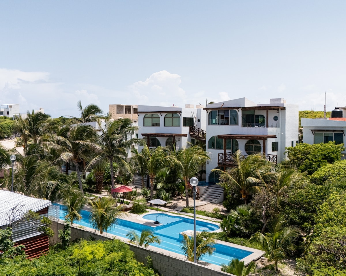 Dreaming of waking up to ocean views? 🌊 Make it real! Just 90m from the beach, your exclusive villa features a private pool, spectacular terrace, 2 beds & 3 baths. Enjoy privacy and luxury in an intimate 4-home complex: swim in the shared semi-olympic lanes, relax at the solarium, or use the BBQ and golf cart parking. 📅 Dates are filling up fast. Book your island sanctuary now!