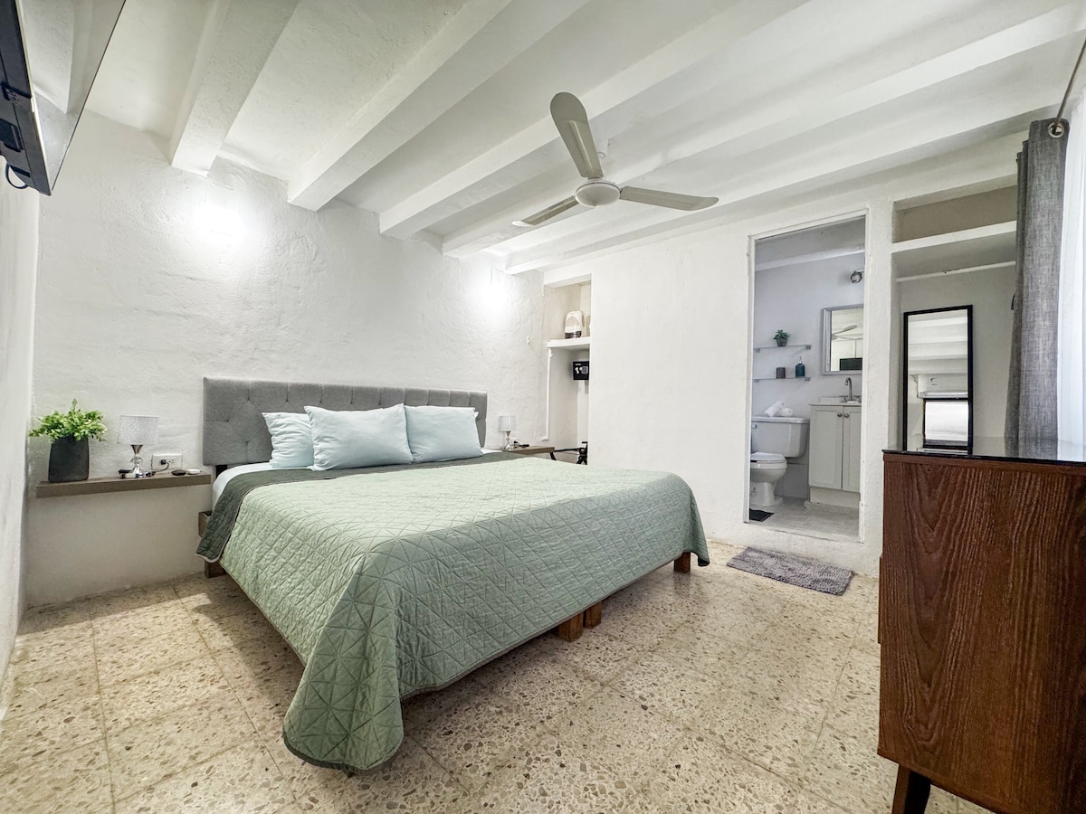 This studio with private entrance is located in my parents' garden, just steps away from the best coffee shop on the island and several tourist attractions, as well as one of the most beautiful beaches, perfect for snorkeling and spotting fish and other small marine species. It features a fully equipped kitchen with a two-burner stove, microwave, blender, coffee maker, and minibar. The studio has a private bathroom, a double bed, Wi-Fi, a TV with Roku, and a dining space or workspace area.