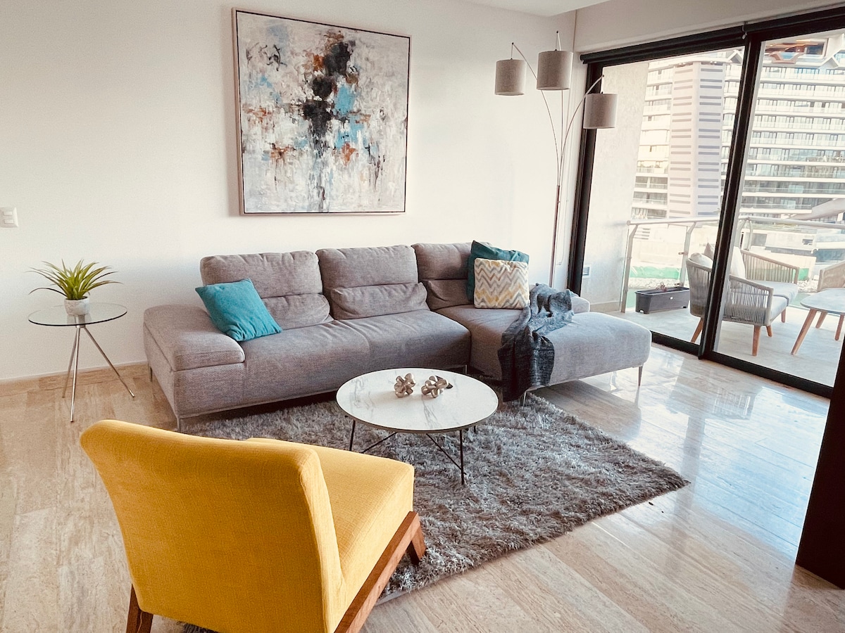 Beautiful Luxury apartment in Puerto Cancun, Hotel Zone, the most exclusive area of the city. Located with a beautiful view of the turquoise blue waters of the Caribbean Sea. Decorated in every detail, your stay will be very pleasant. It has all the necessary services, private parking, access with code and an enviable location! the condominium is connected to the Marina Puerto Cancun Shopping Center and you can walk down to find restaurants, shops, entertainment, etc.