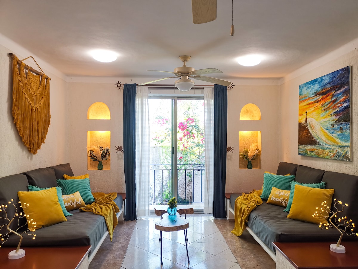 Lujoso departamento con diseño de revista escondido en un barrio local, a bajo costo, con muebles hechos a mano, y todo lo necesario para que descanses y disfrutes al máximo el mar caribe. 2 recámaras, cocina equipada, 3 A/C y 3 Smart TVs, y artículos para playa. Además, servicios adicionales de cocina, acceso a un beach club, transporte a la zona hotelera, rentals y tours disponibles. No es solo un depa; es una experiencia local de lujo, diseño, hospitalidad y confort, sin pagar de más.