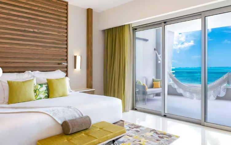 Luxury All-inclusive Resort on the beach in Cancun. The 588 sq. ft. Junior Suite provides the feeling of intimacy while featuring a spacious bedroom, bathroom, and private balcony with beautiful landscape views. Good for a couple or a family of 4. All meals and drinks are included. FEATURES: Garden or Sunset View Private terrace with furniture and hammock One king or two queen-size beds Free standing soaking bathtub Butler service Junior Suite can accommodate between 2 - 4 people.