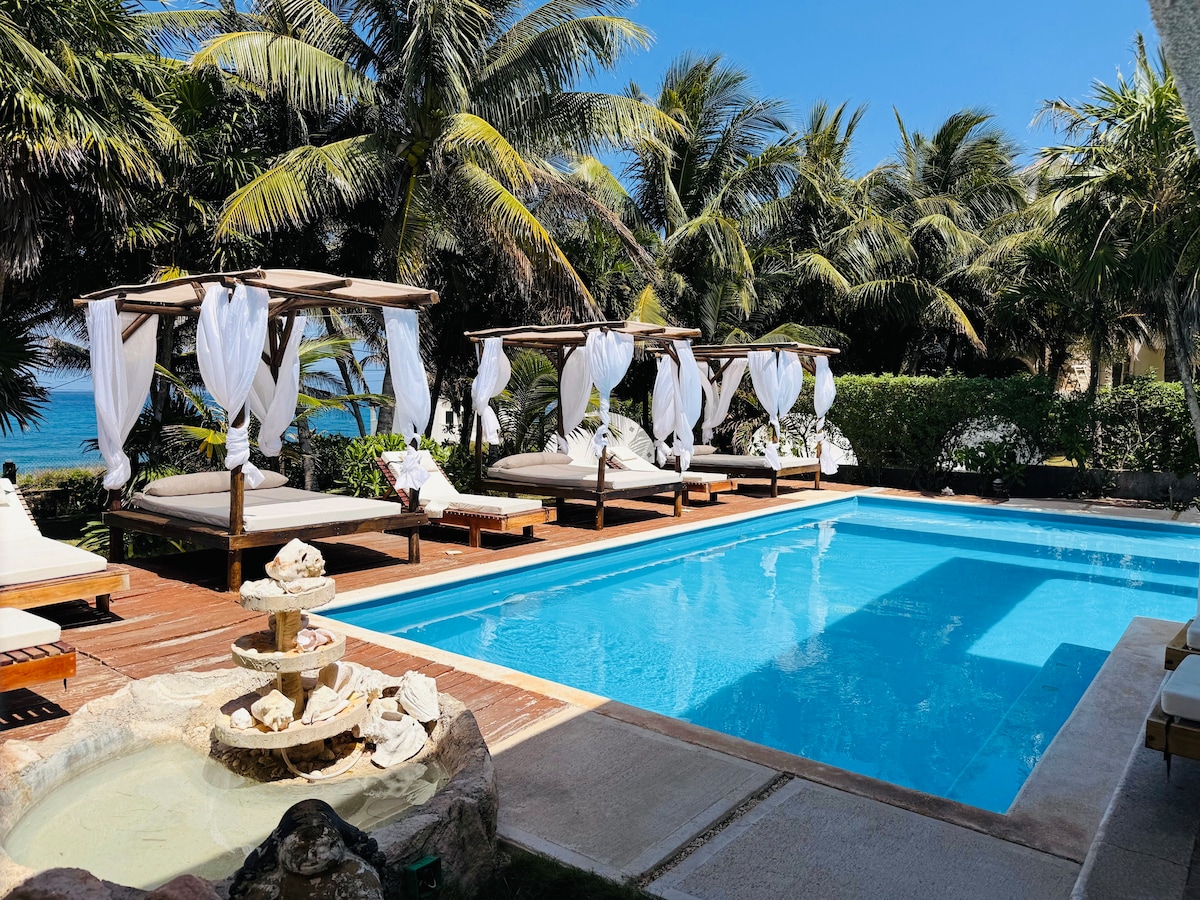 Live the experience of staying in a house facing the Caribbean Sea. With a large and heated pool you have direct access to the beach where, in season, you will see turtles that lay hundreds of eggs, right there in our yard. From the kitchen, its balcony as its three bedrooms will delight you with the sunrise and the moonrise. The large palapa at the roof offers unlimited views of the sea from the east to west and a spectacular sunset. In this house you will have memories that will last forever.