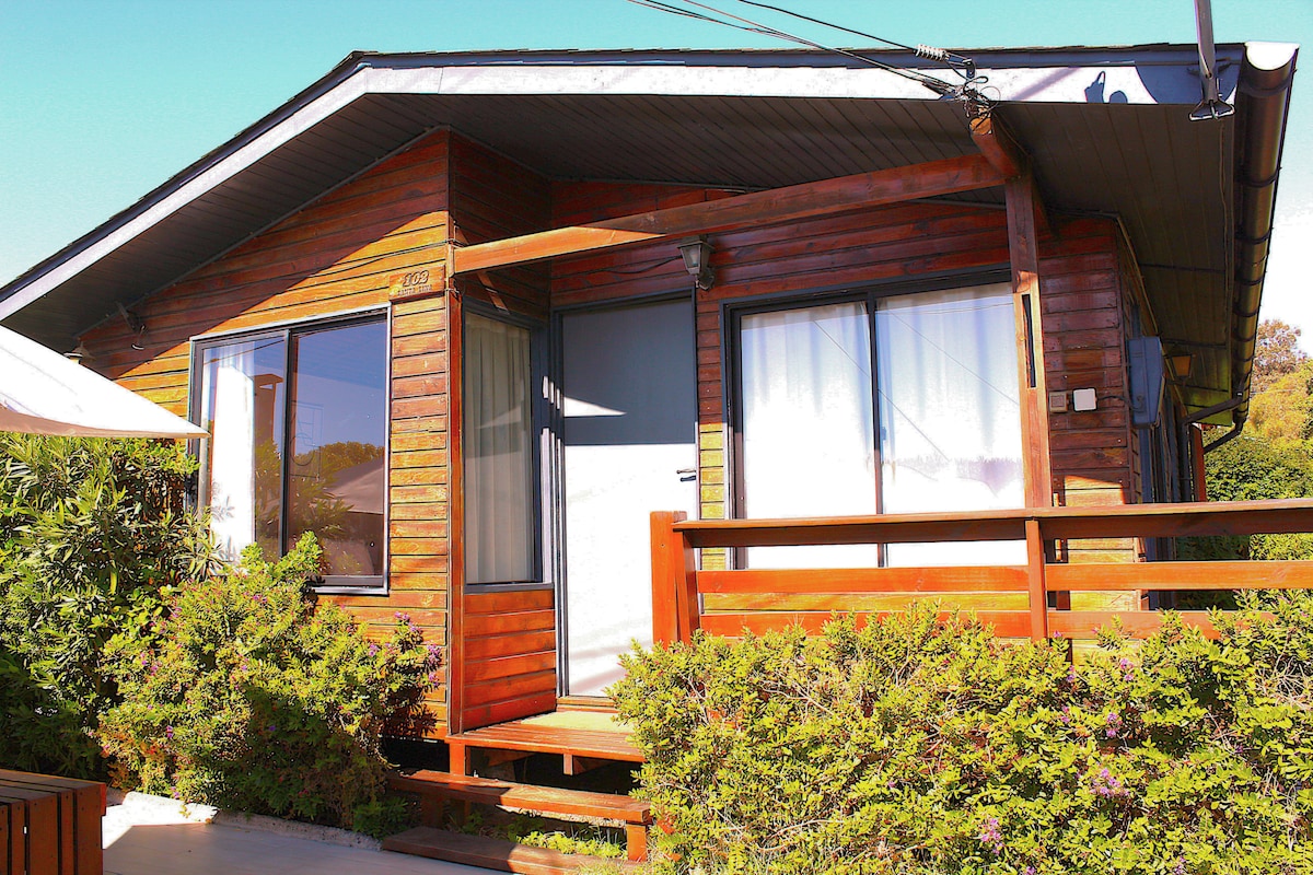 Cabaña de 1 ambiente ubicada en sector céntrico del Balneario de Las Cruces. A 2 cuadras de Playa Chica (Las Cadenas). Equipada para 2 personas. 1 Cama matrimonial Refrigerador, Calefont, Tv Cable MundoGo, Estufa a gas (Invierno), Calientacamas eléctrico, Balcón con hermosa vista a la quebrada. Sin estacionamiento propio. (Estacionamiento sitio cercano - Opcional) Servicio de internet (wifi)