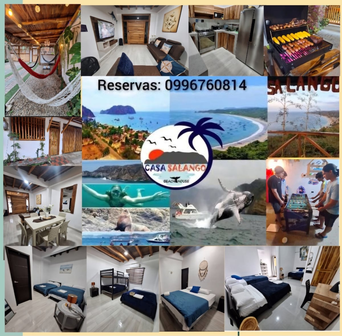 Relájate con tu grupo familiar o amigos en este hermoso lugar cerca de muchas playas para que puedas conocer y disfrutar. Casa Salango es acogedora con estilo playero, ideal para hospedarse en grupos de hasta 16 personas que buscan descanso y seguridad. La casa esta totalmente amoblada, A/C y baño en cada habitacion, Garaje privado, cocina equipada. Además si prefieres la vida nocturna, Puerto López se encuentra a solo 5 minutos en carro. ¡La opción ideal para unas memorables vacaciones!.