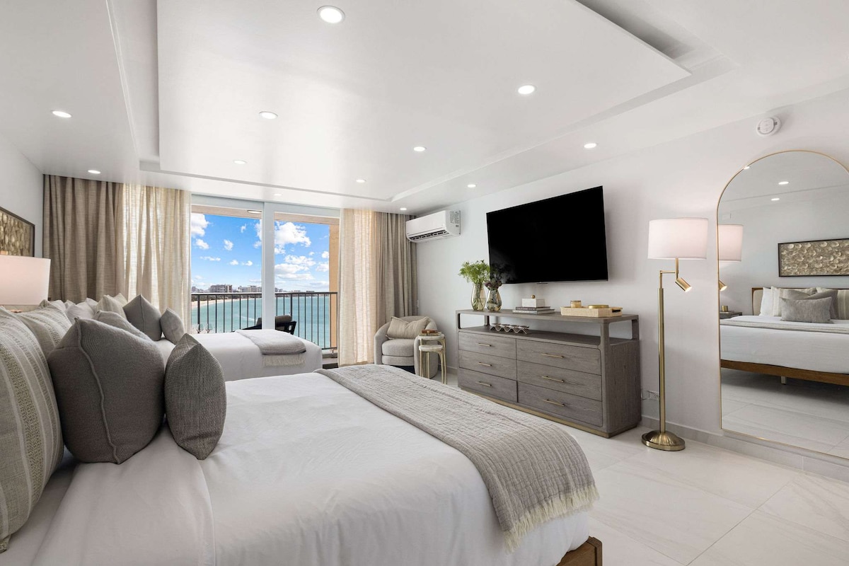 Privately owned Jr 1-Bedroom at ESJ Towers, next door to the El San Juan/ Fairmont Hotel. This 16th-floor apartment sits directly on a beautiful sandy beach alongside water sports and beach restaurants. King bedroom, recessed lighting, all white bedding and walls, 50" smart TV, Bluetooth speaker, washer and dryer, closet safe, full kitchen, and indoor parking space. Building amenities include a gym, lobby business center, and 24-hour gated security.