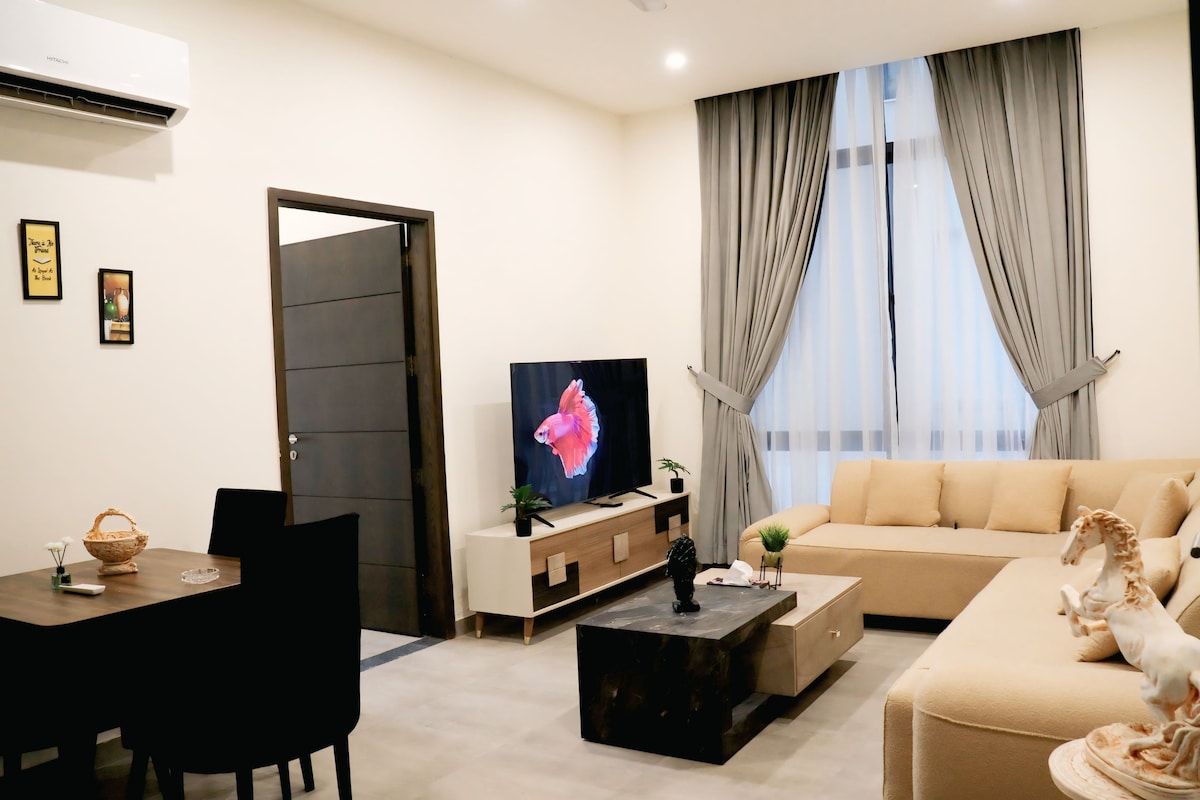 Stay @ Centaurus Mall designed only for classy & refined guests who value quality. Our Modern 1 -bed apartment is the embodiment of modern luxury, large size apartment, spacious bedroom with a spacious lounge, separate kitchen, & dining area. This space is designed to provide you with the utmost comfort & sophistication. Be captivated by Panoramic views of the beautiful city from every corner of the apartment. These apartments offer more than just scenery; they create unforgettable memories
