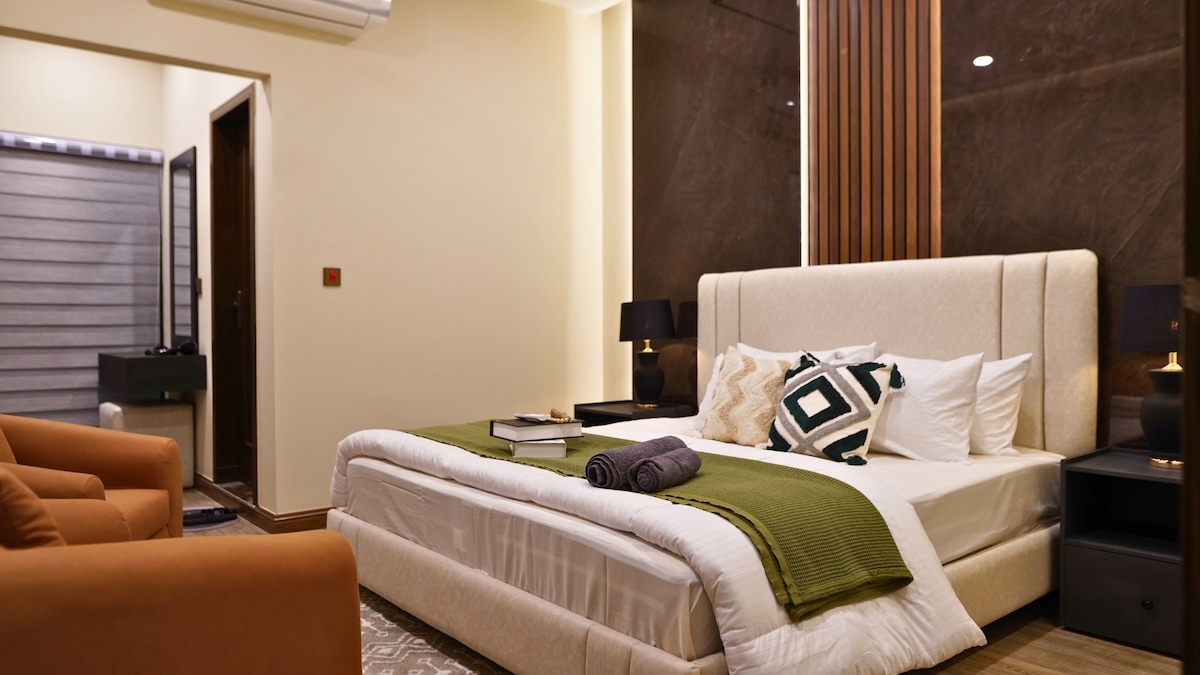 A stylish designer suite located on the 4th floor in the heart of Islamabad, just steps from F-11 Markaz. Bright, airy, and thoughtfully furnished, the space offers a perfect blend of comfort and elegance. Ideal for travellers with a cozy bedroom, modern kitchenette, and secure surroundings. Enjoy easy access to top cafes, restaurants, and shops, all within walking distance. Note: “Strictly only for families, unmarried couples/parties are not allowed” One vehicle parking is allowed