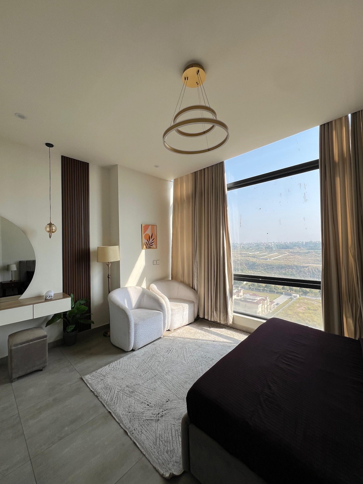 A 1700 sq. ft. 2-bedroom boutique apartment located in the serene heart of Bahria Town. Perched on an elevated floor, this thoughtfully curated home is bathed in natural light and offers both north and south-facing open views with shops and restaurants at just walking distance. Designed for comfort and elegance, it's ideal for families, couples, business travellers, or anyone seeking a peaceful yet well-connected stay in Islamabad.
