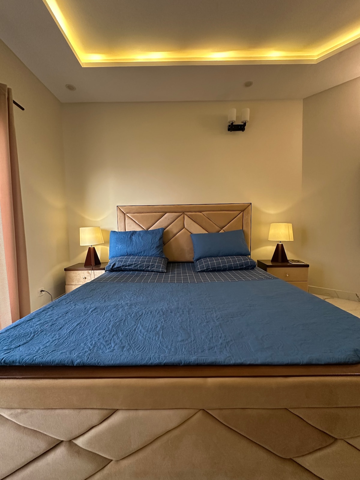 Welcome to @blueoakresidences Spacious 1500 Sq ft apartment in F-11/1 Islamabad with 2 ensuite bedrooms each with a private balcony, Powder room, UPS backup, Fast WiFi, Self check-in, and a 58" smart TV. Kitchen, hot water, free parking, 24/7 elevator included. For groups larger than 4, 2 extra floor mattresses are provided for up to 6 guests. Bassinet available on request for 3+ nights (PKR 5000). Steps from Loafology, Nando's, Asian Wok, KFC, Al-Fatah. Family-friendly park right outside.