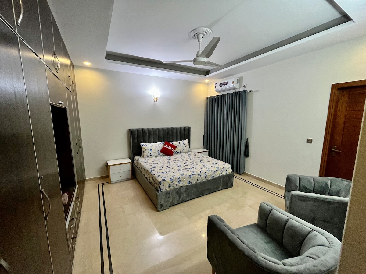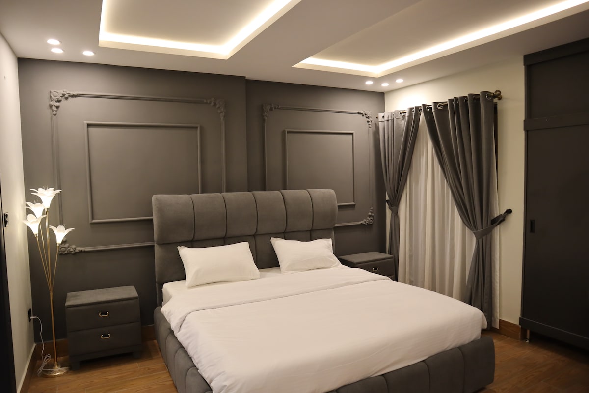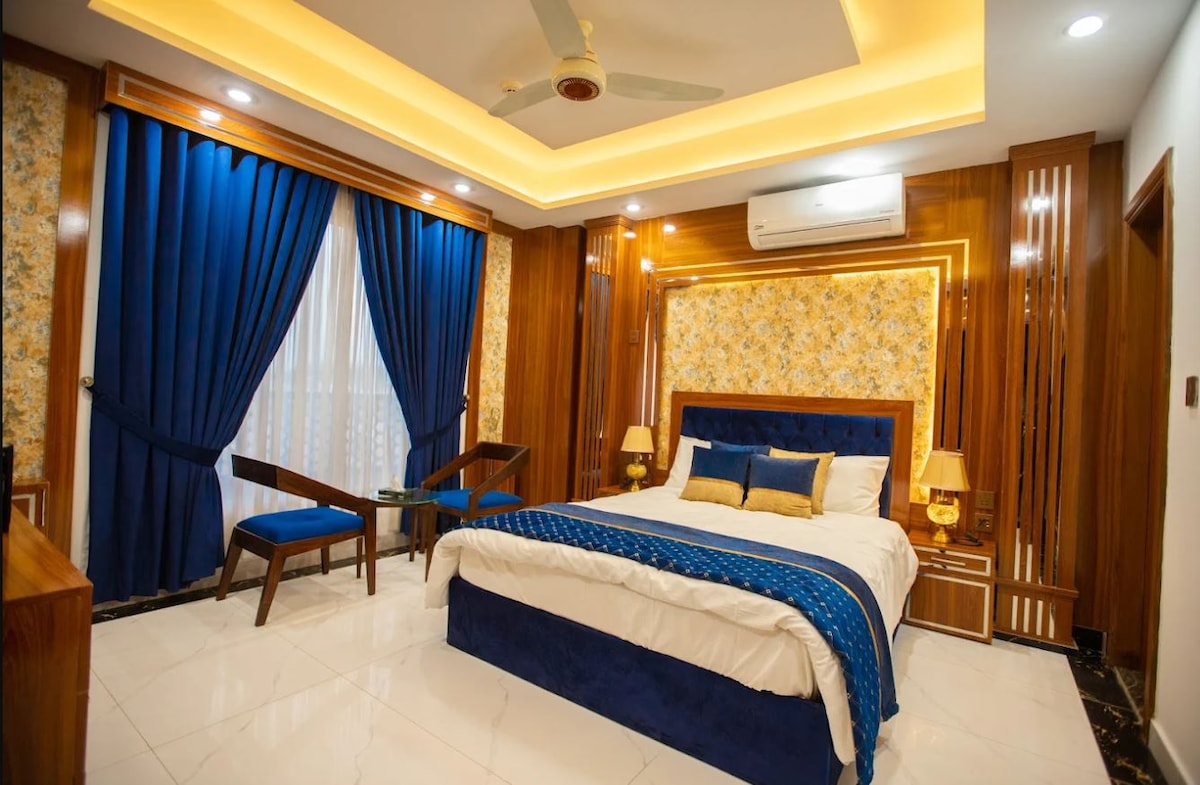 Welcome to the luxury suite, located in G7 Markaz, Islamabad. Our elegantly designed suite offers modern furnishings, a spacious layout, and a private attached bathroom with hot and cold water. Enjoy a flat-screen TV for entertainment and complimentary high-speed Wi-Fi. Start your day with a delicious breakfast for two, included with your stay. 24/7 reception. Conveniently situated near Centaurus Mall and Faisal Mosque, our hotel guarantees an unforgettable experience.