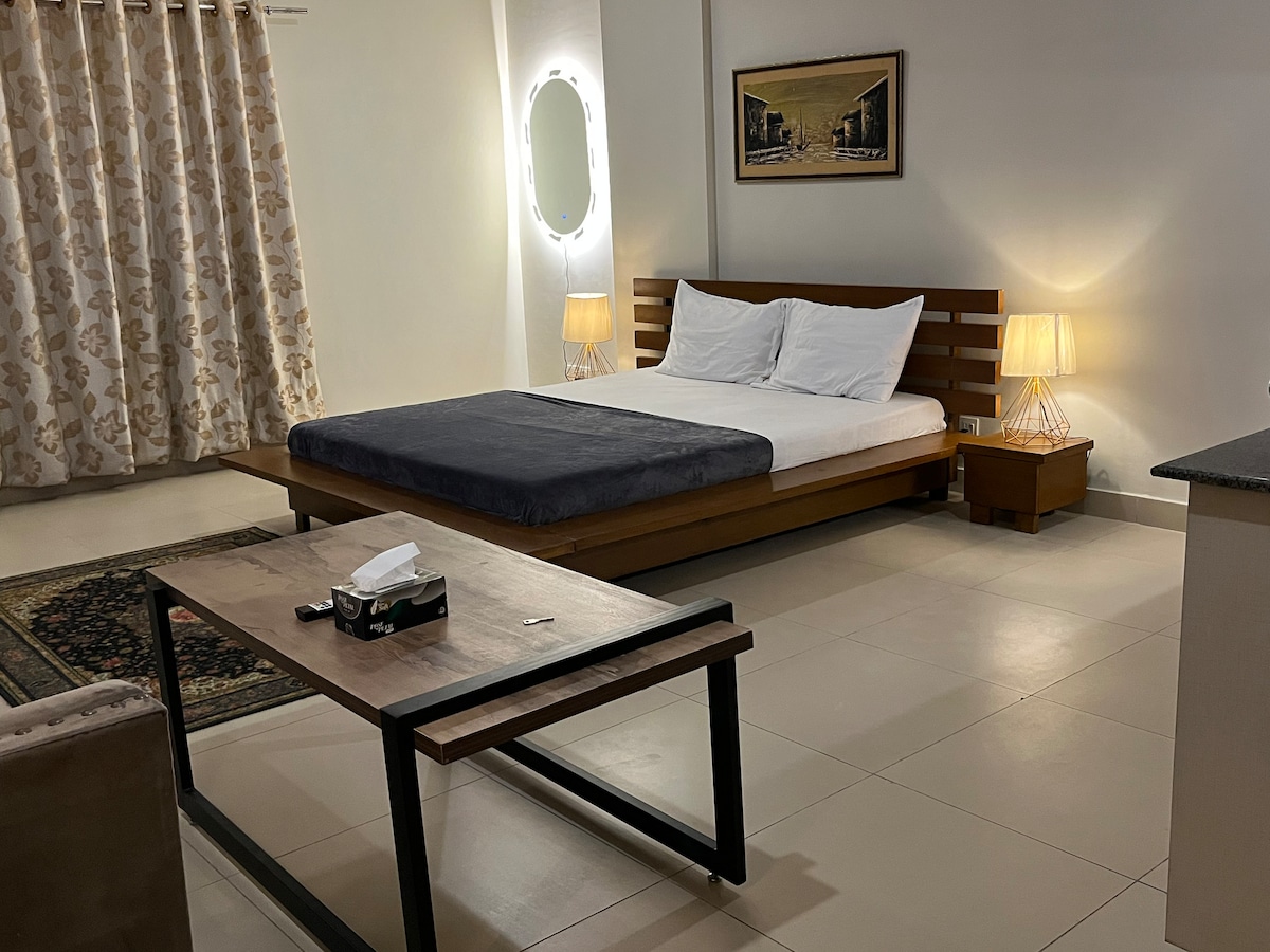 Contemporary & Luxurious 1 BHK in Seven Star Heights – Bahria Town Phase 8 ▸ Premium, secure building with designer lobby & lifts ▸ Gated complex with 24/7 security & expat-friendly vibe ▸ 15 mins to Giga Mall, Amazon Mall & DHA 2 Central Park ▸ 7 mins to Phase 7 Food Street – Ranchers, Nandos, KFC ▸ Keyless self check-in with access code ▸ Fast WiFi – perfect for work-from-home setups ▸ Digital guidebook included – explore like a local Book now and experience luxury living at its finest.