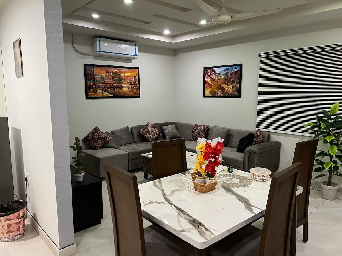 Welcome to our elegant and well-maintained banglow. This listing is for a private portion of the house, thoughtfully designed for family comfort. The portion is located on the First floor and offers three furnished bedrooms, each with an attached private washroom, along with a fully equipped kitchen and a comfortable lounge, dinning. The space is professionally cleaned and includes AC, TV, high-speed Wi-Fi, fresh linens, and essential amenities. Secure, peaceful, and exclusively for families.